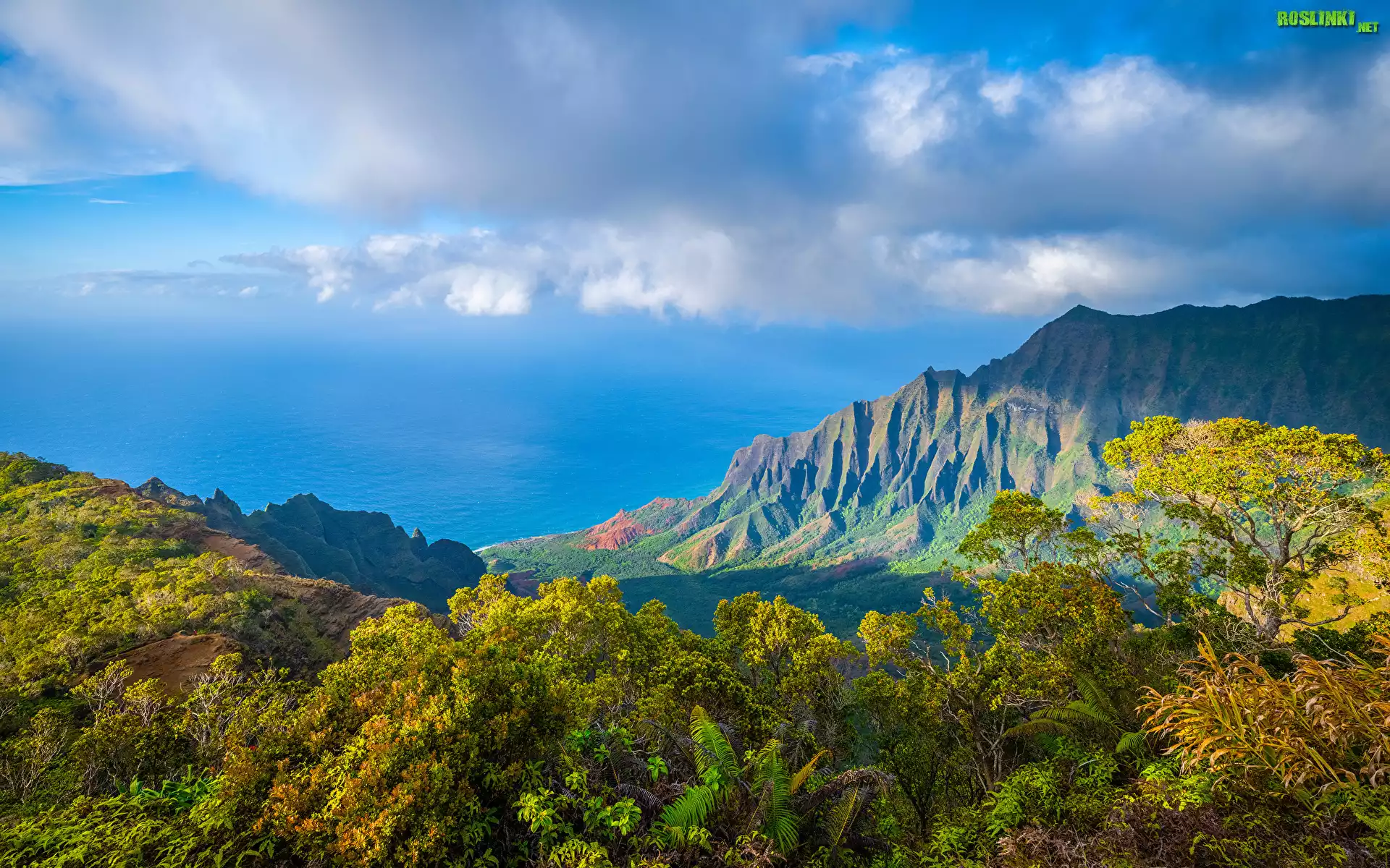 Rośliny: Stany Zjednoczone, Hawaje, Dolina, Kalalau Valley, Góry, Niebo, Białe, Chmury, Drzewa