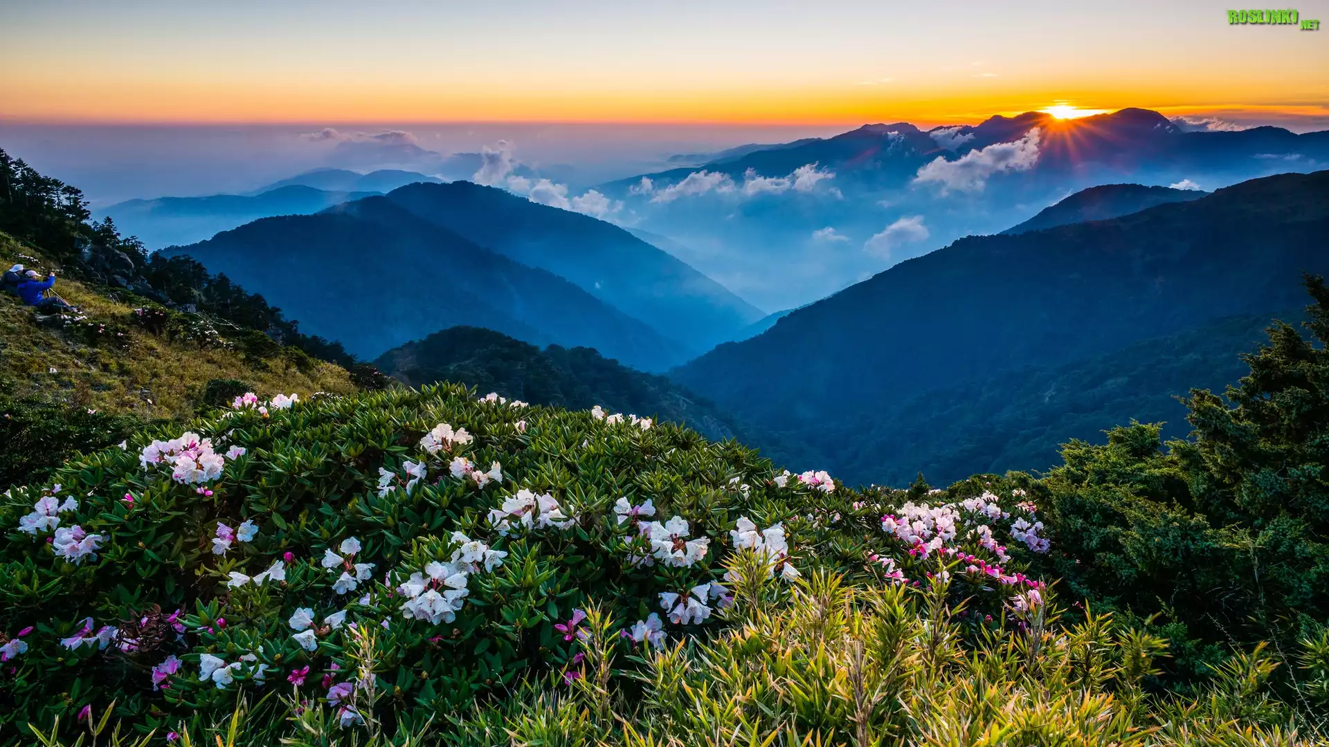 Rośliny: Góry, Kwiaty, Polana, Rododendrony, Azalie, Mgła, Niebo, Zachód słońca
