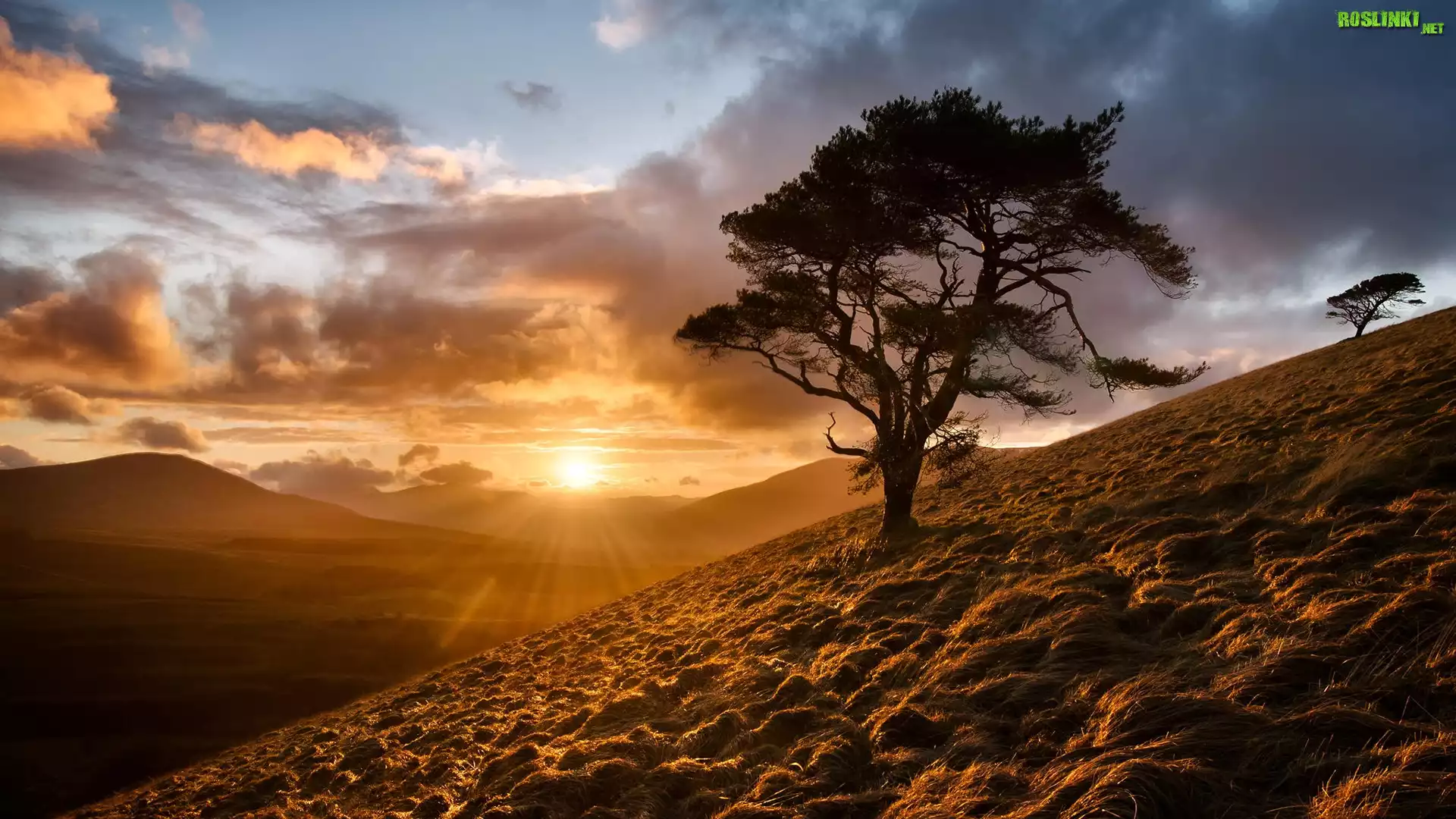Rośliny: Góry, Zachód słońca, Chmury, Niebo, Drzewo