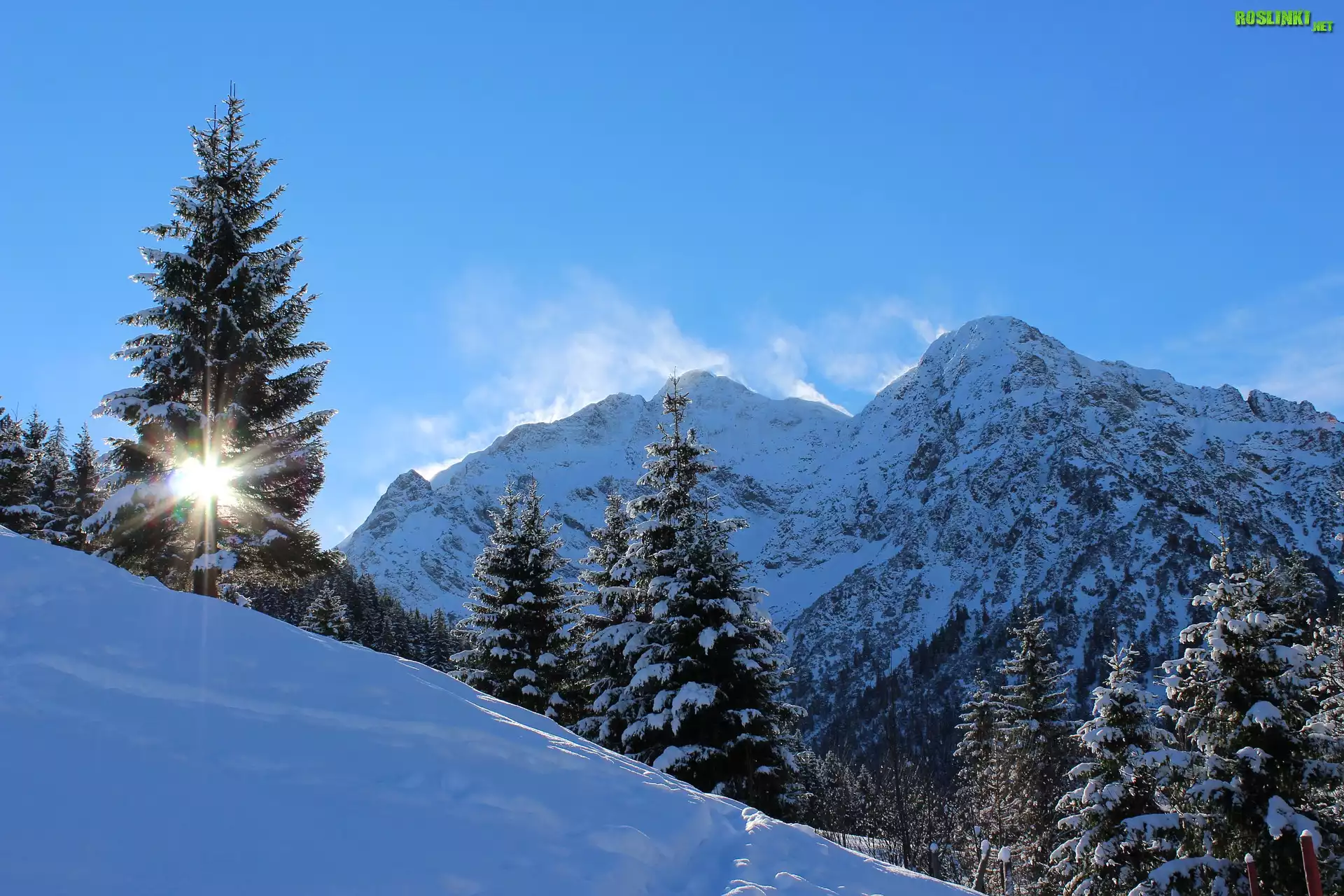 Rośliny: Zima, Góry, Śnieg, Promienie Słońca, Drzewa, Świerki, Niebo