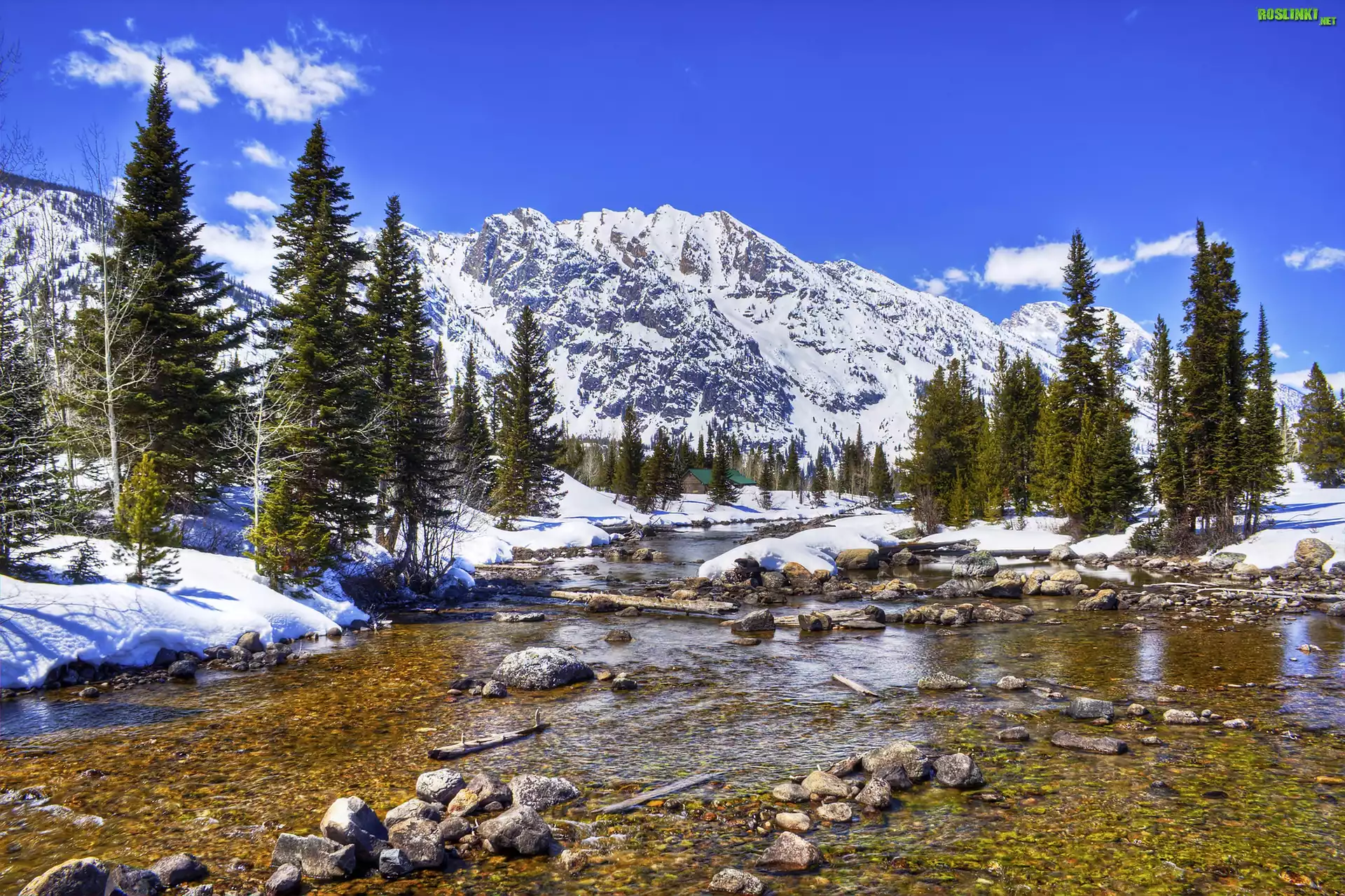 Rośliny: Góry, Rzeka, Śnieg, Świerki