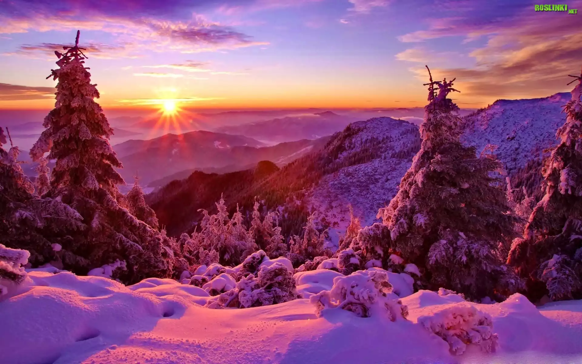 Rośliny: Zima, Góry, Drzewa, Świerki, Ośnieżone, Wschód Słońca, Śnieg