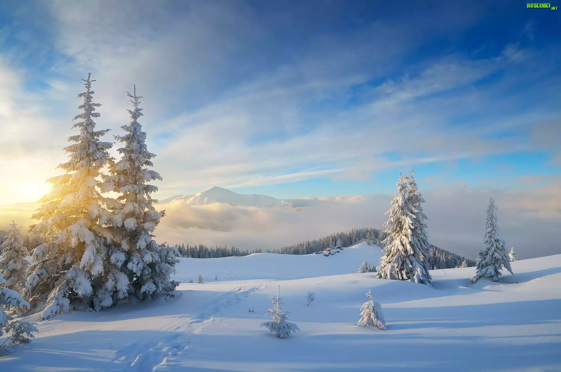 Rośliny: Góry, Wschód słońca, Chmury, Ośnieżone, Świerki