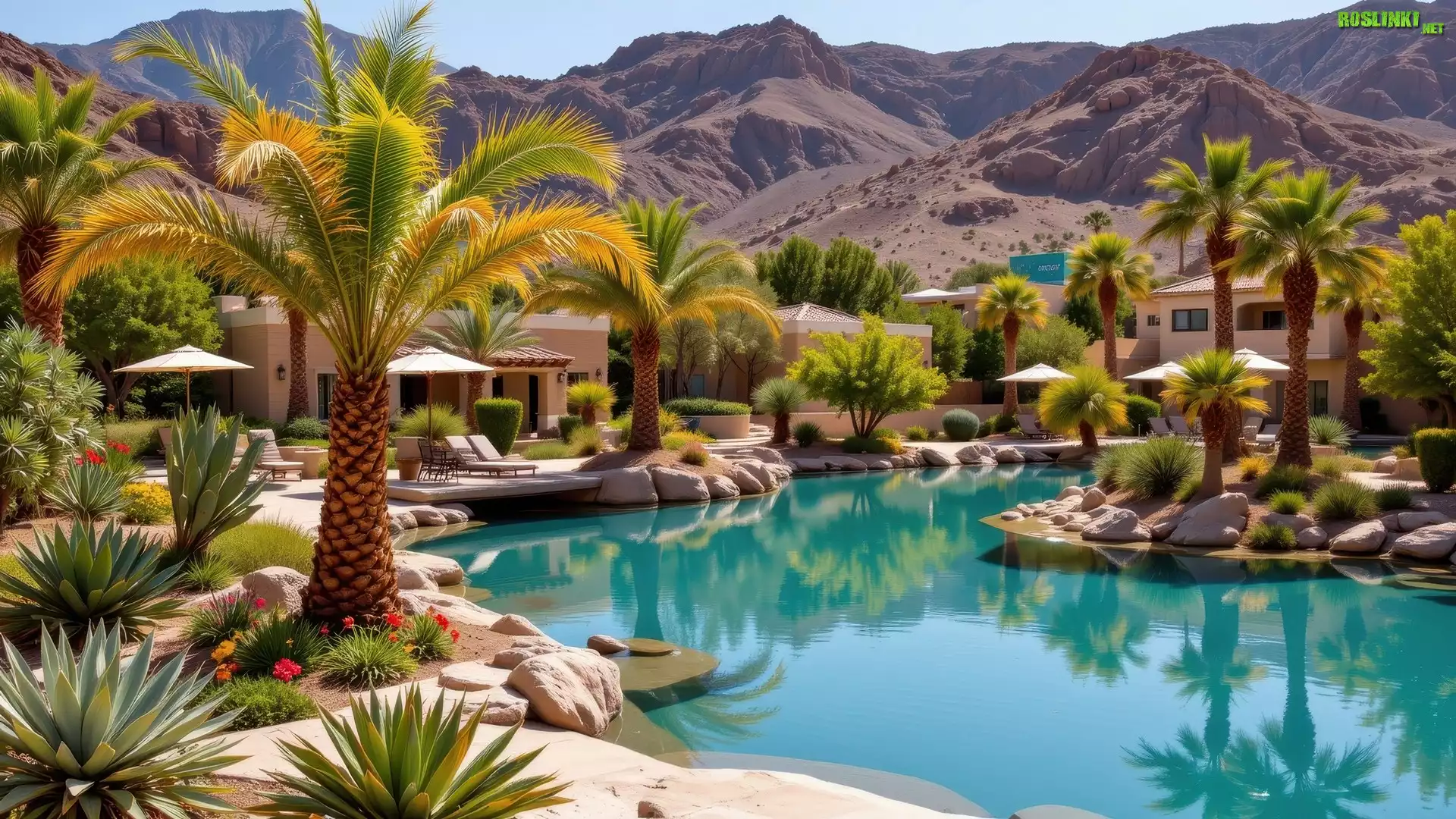 Domy, Basen, Palmy, Kwiaty, Rośliny, Parasole, Kamienie, Góry