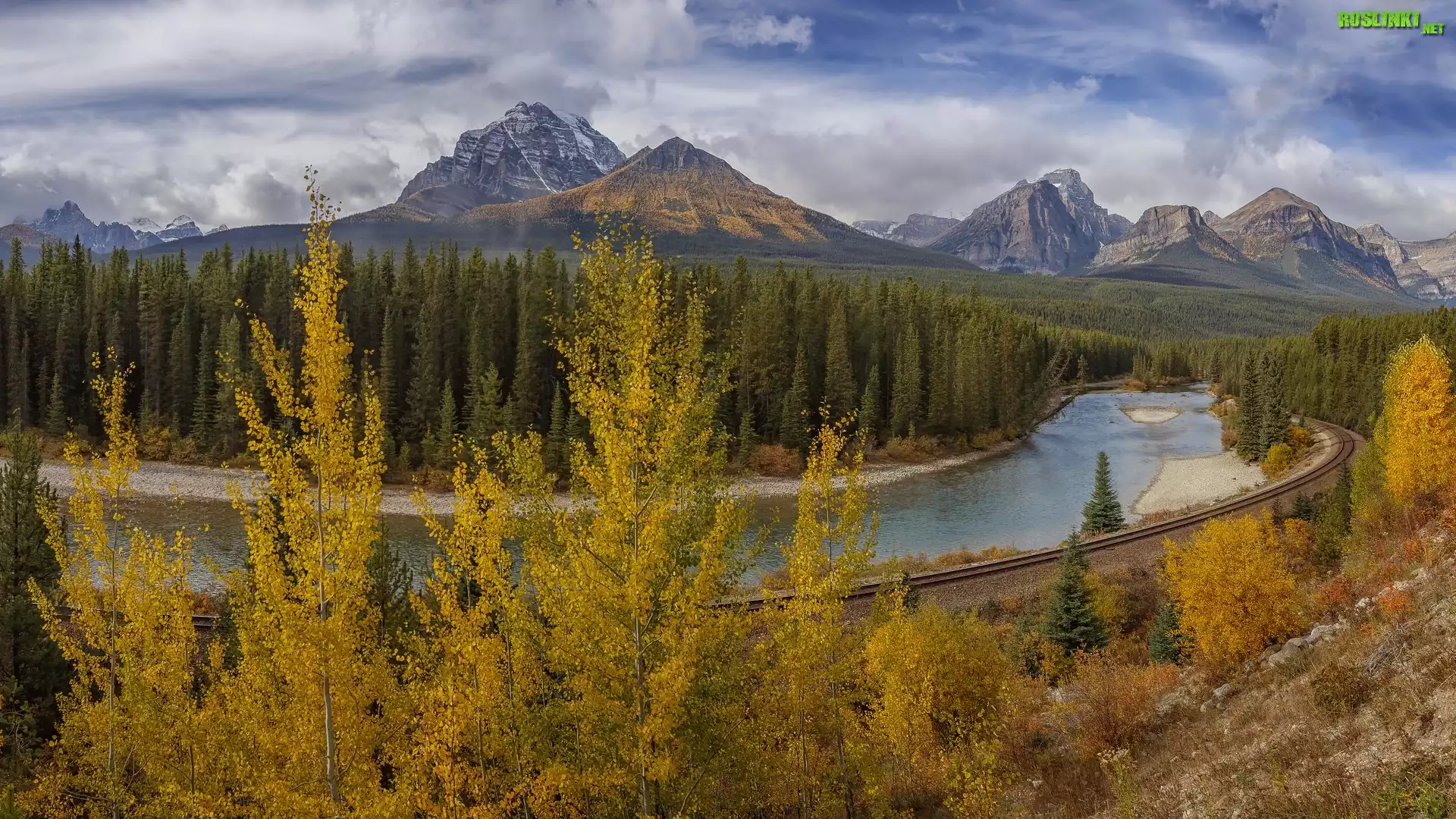 Góry, Canadian Rockies, Drzewa, Lasy, Jesień, Rzeka, Bow River, Park Narodowy Banff, Tory kolejowe, Chmury, Alberta, Kanada |