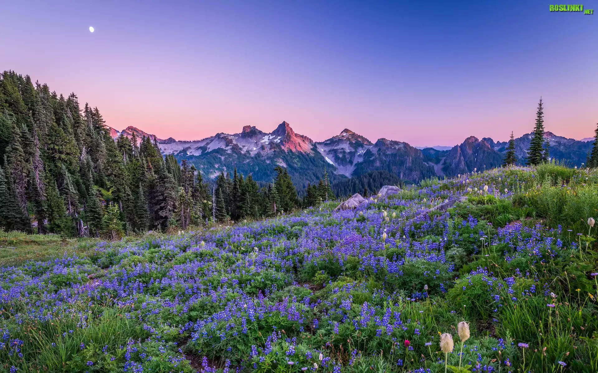 Park Narodowy Mount Rainier, Góry, Księżyc, Drzewa, Łąka, Łubiny, Kwiaty, Stan Waszyngton, Stany Zjednoczone |