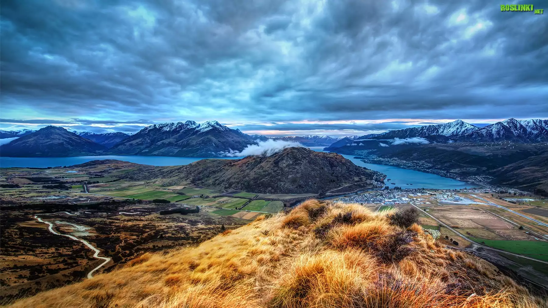 Góry, Jeziora, Miasteczko, Pola, Trawy