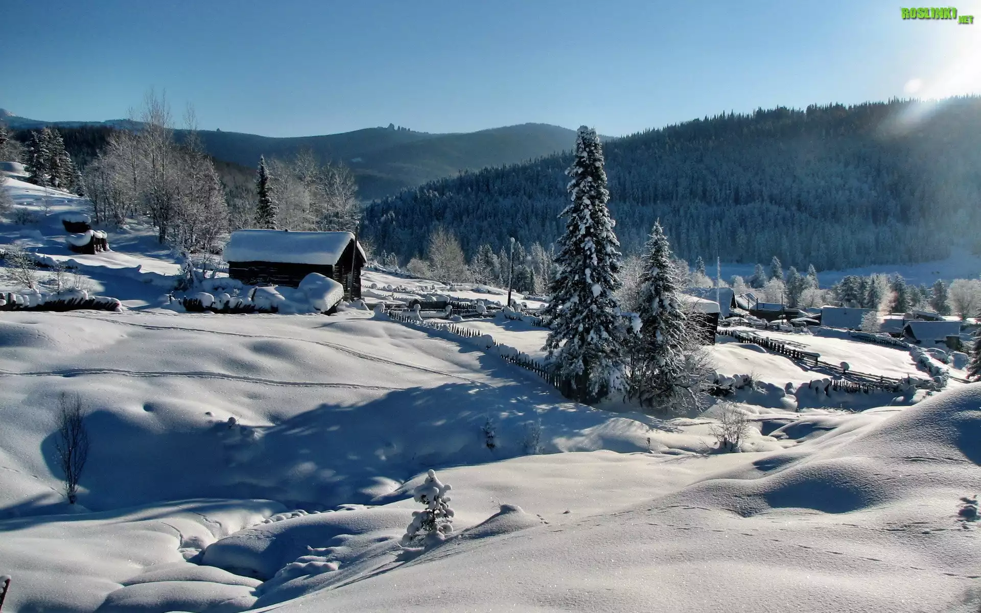 Rośliny: Góry, Lasy, Domek, Śnieg, Promienie, Słońca