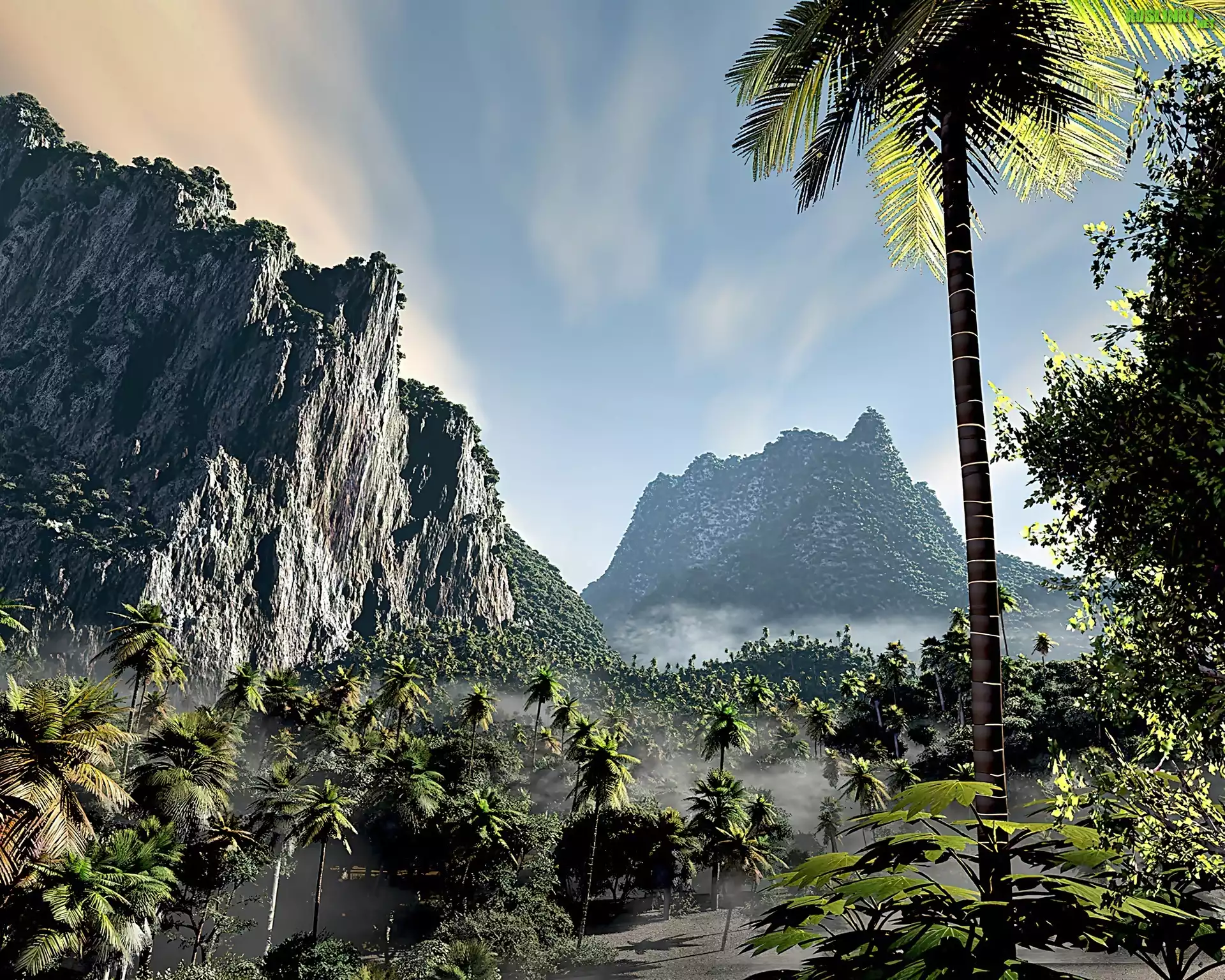 Rośliny: Góry, Las, Palmowy, Mgła, Przebijające, Światło