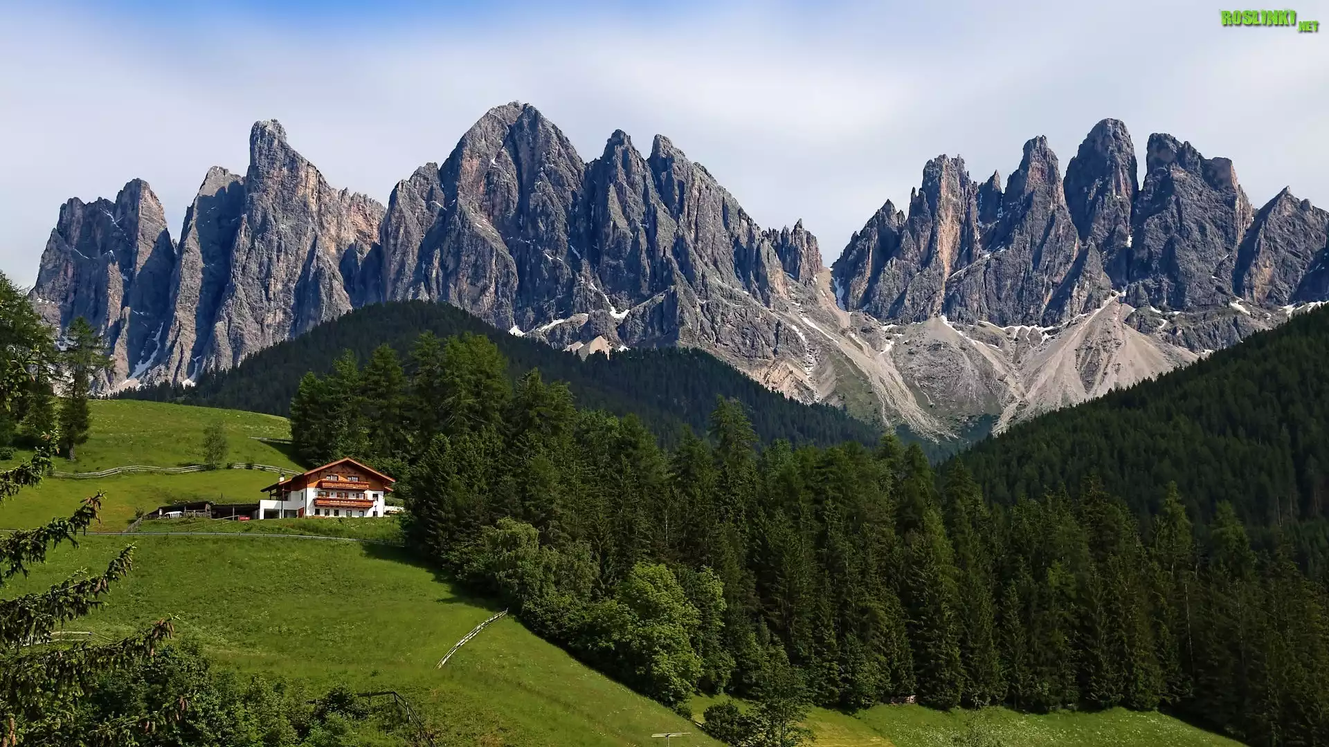 Góry, Dolomity, Drzewa, Dom, Park Przyrody Puez Odle, Włochy