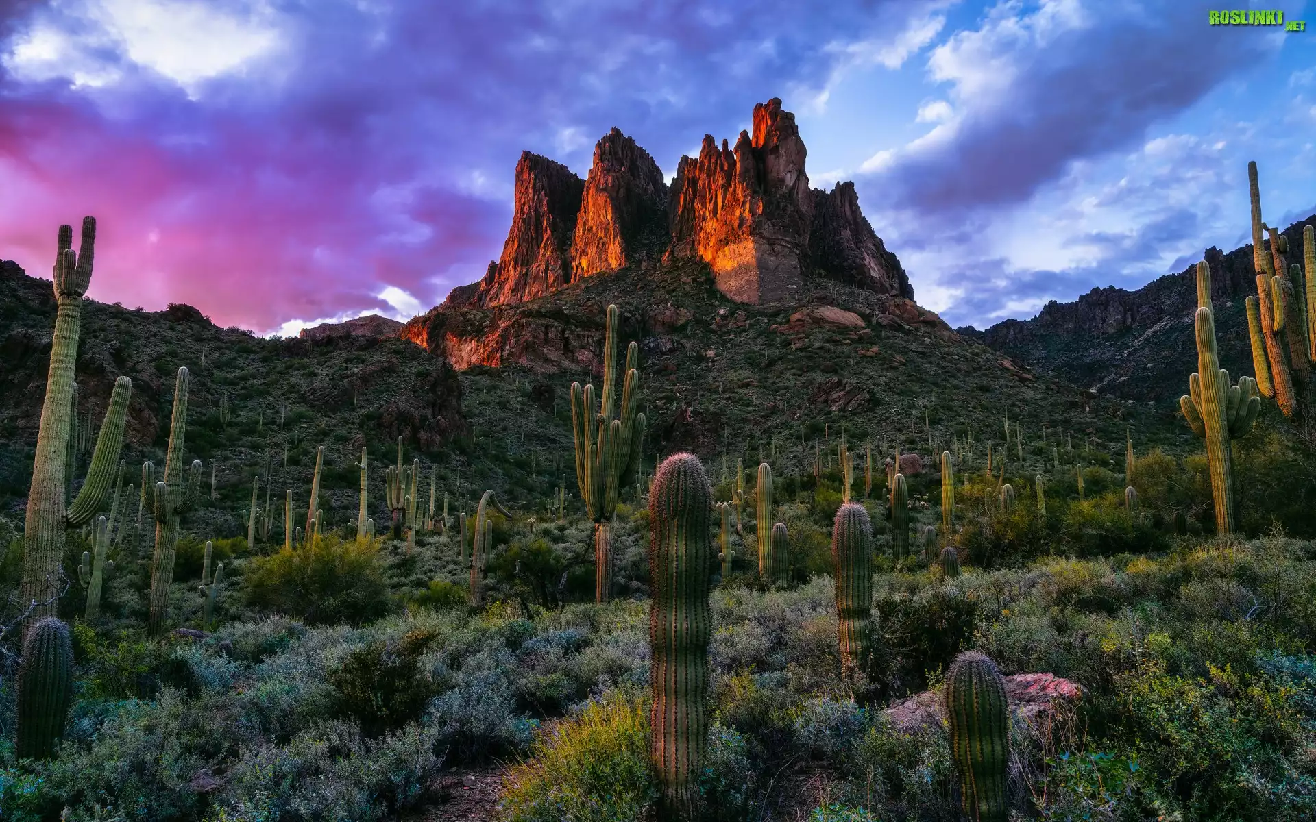 Stany Zjednoczone, Arizona, Góry, Superstition Mountains, Skały, Kaktusy, Drzewa, Roślinność, Chmury, Zachód słońca |