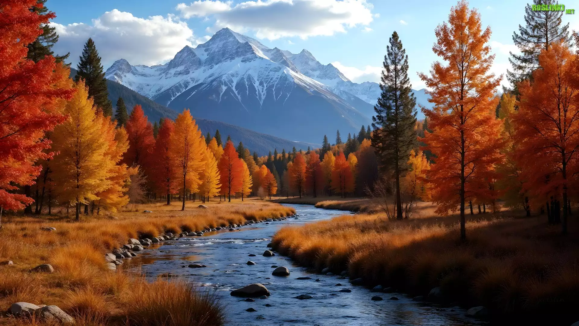 Rośliny: Jesień, Drzewa, Rzeka, Góry, Szczyty, Ośnieżone, Śnieg
