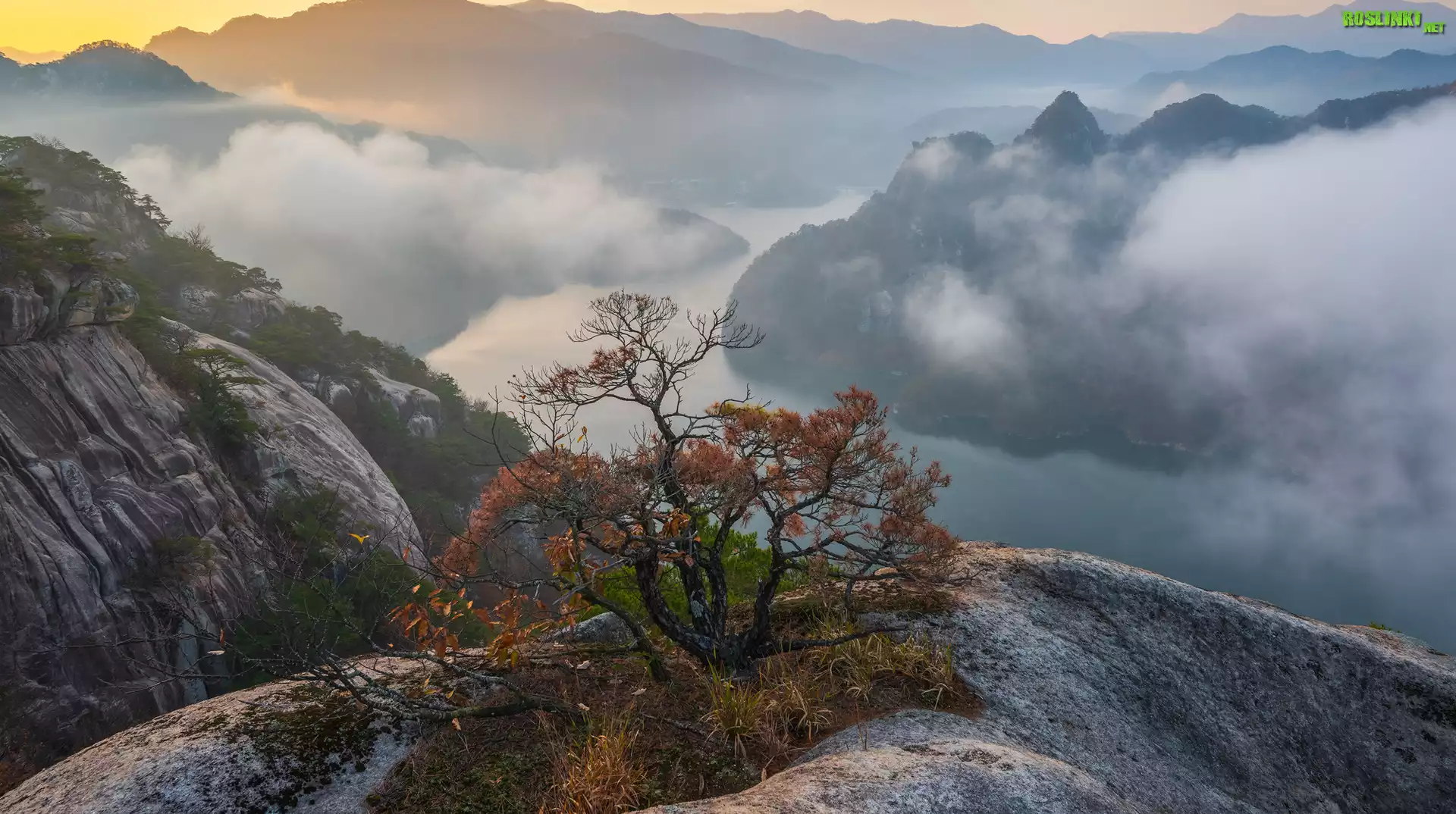 Rośliny: Góry, Skały, Drzewo, Krzew, Rzeka, Chmury