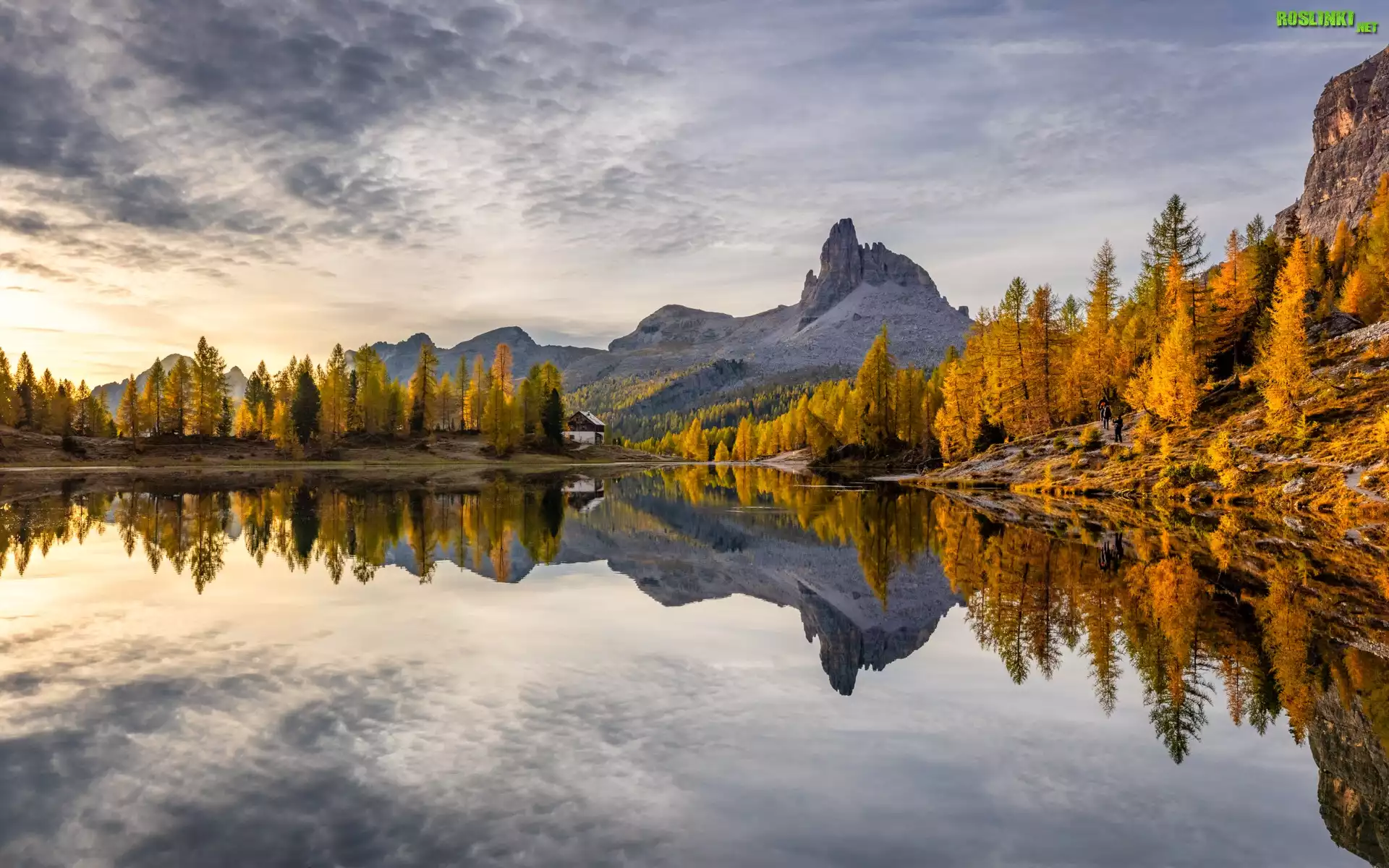 Jezioro, Federa Lake, Góry, Dolomity, Las, Drzewa, Jesień, Dom, Schronisko, Prowinca Belluno, Włochy |