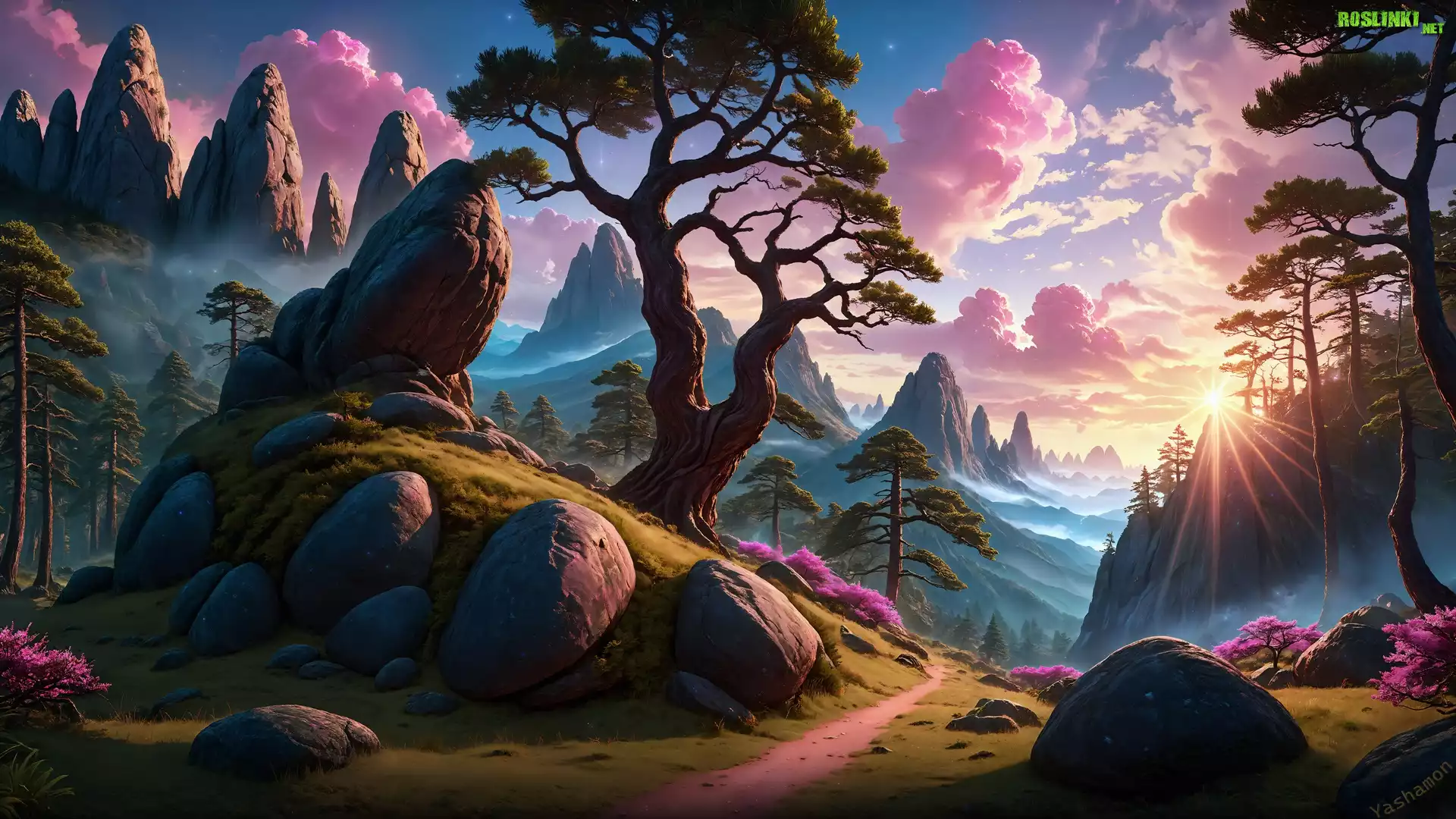 Rośliny: Ścieżka, Drzewa, Skały, Góry, Promienie słońca, Grafika