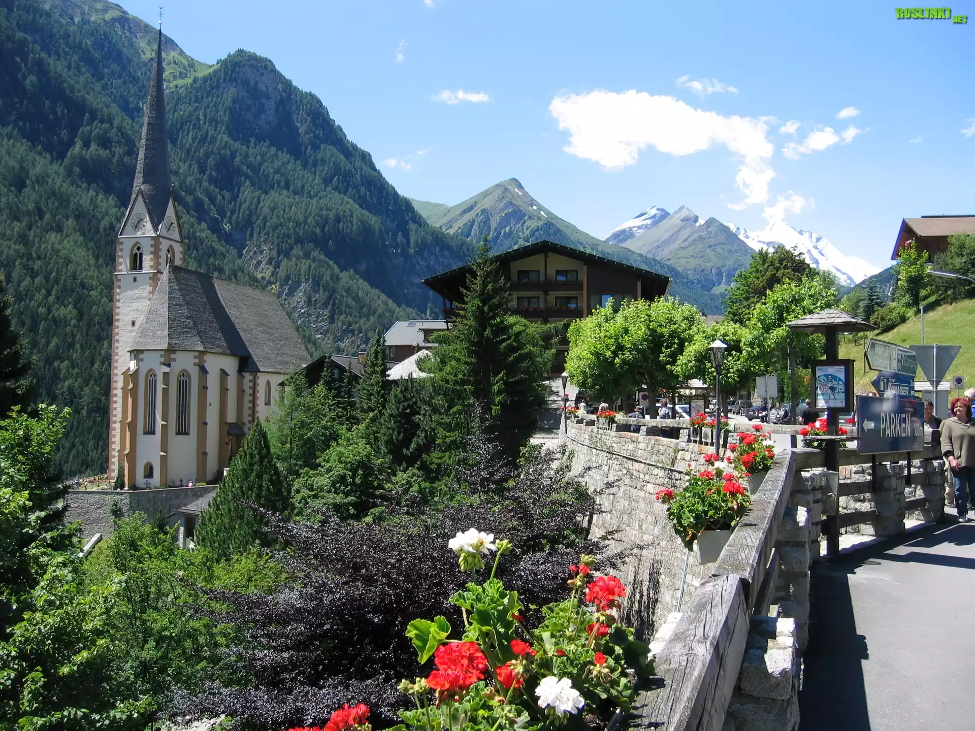 Góry, Wioska, Domy, Kościół, Skrzynki, Pelargonie