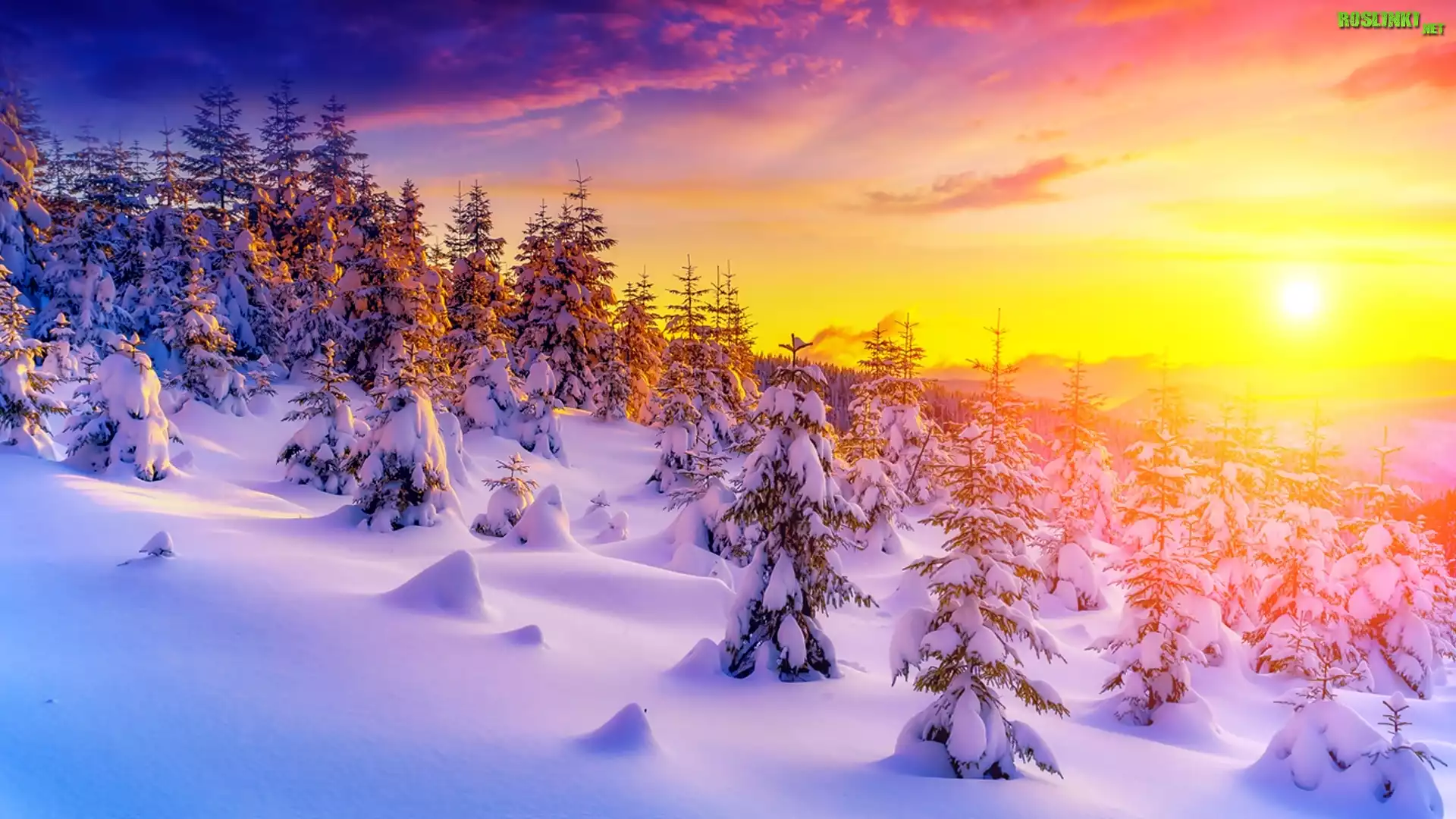 Rośliny: Góry, Drzewa, Chmury, Wschód słońca, Zima