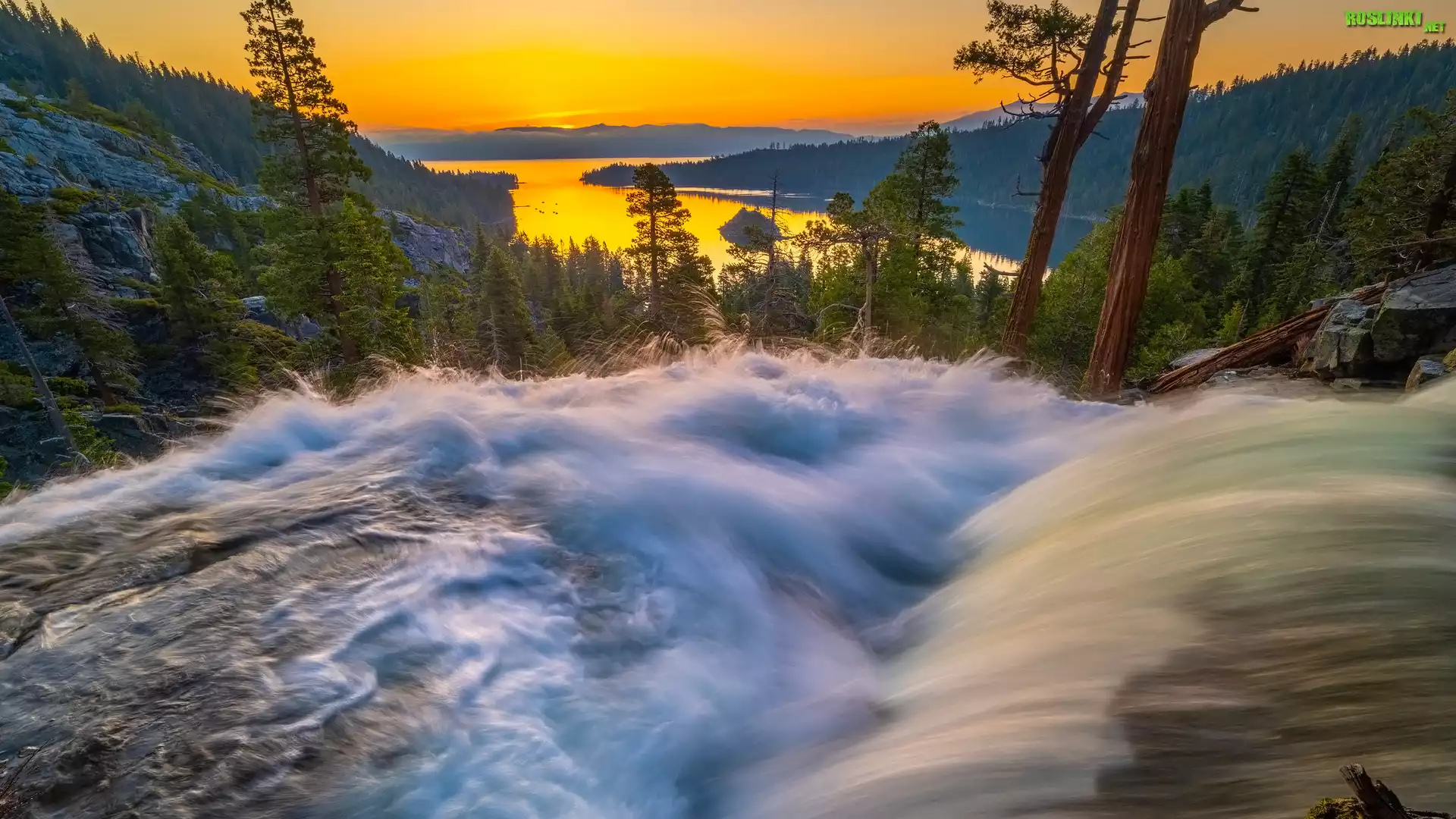 Jezioro, Tahoe Lake, Góry, Sierra Nevada, Rzeka, Drzewa, Zachód słońca, Kalifornia, Stany Zjednoczone |