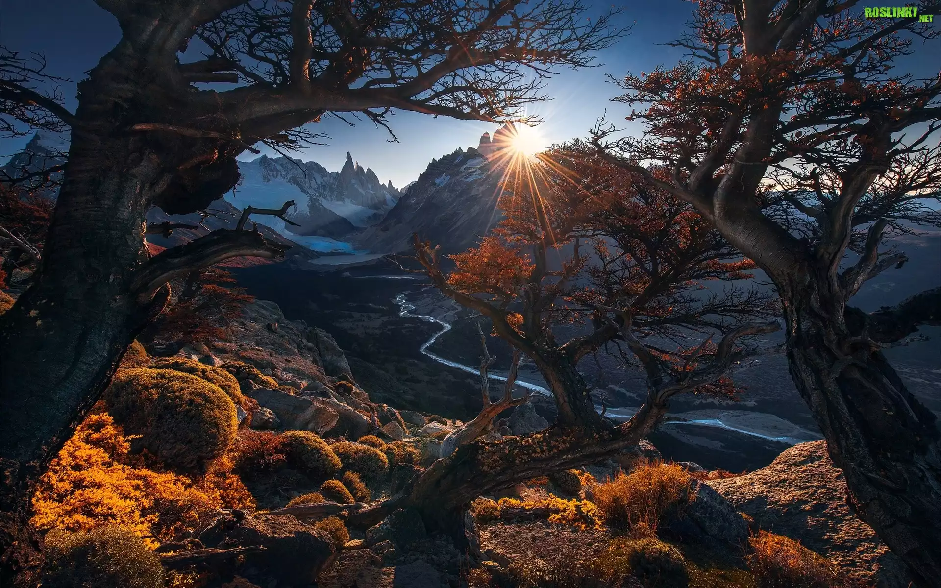 Argentyna, Patagonia, Park Narodowy Los Glaciares, Jesień, Drzewa, Góry, Szczyt Fitz Roy, Rzeka Rio de las Vueltas, Promienie słońca |