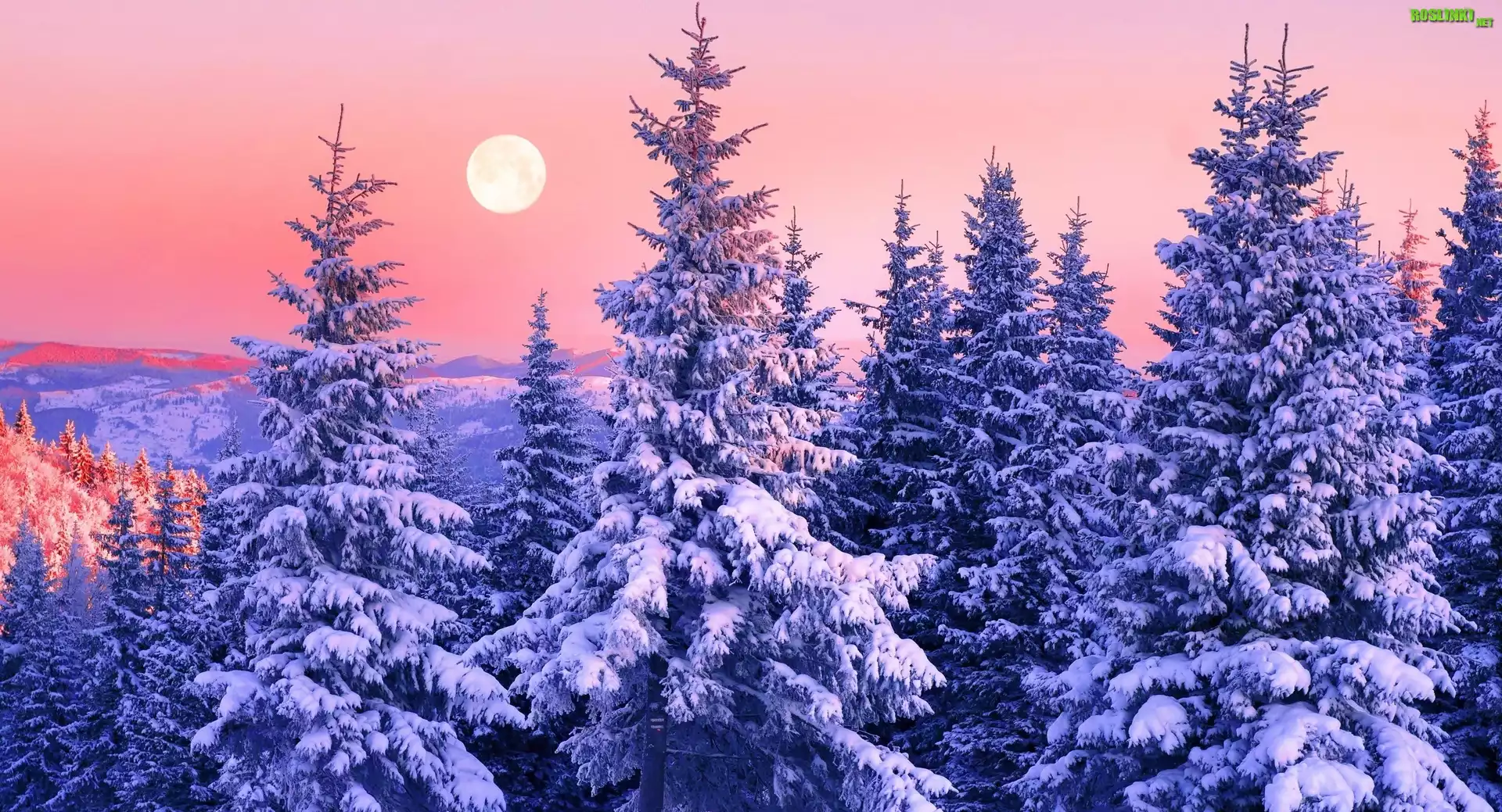 Rośliny: Góry, Ośnieżone, Świerki, Zachód słońca, Zima