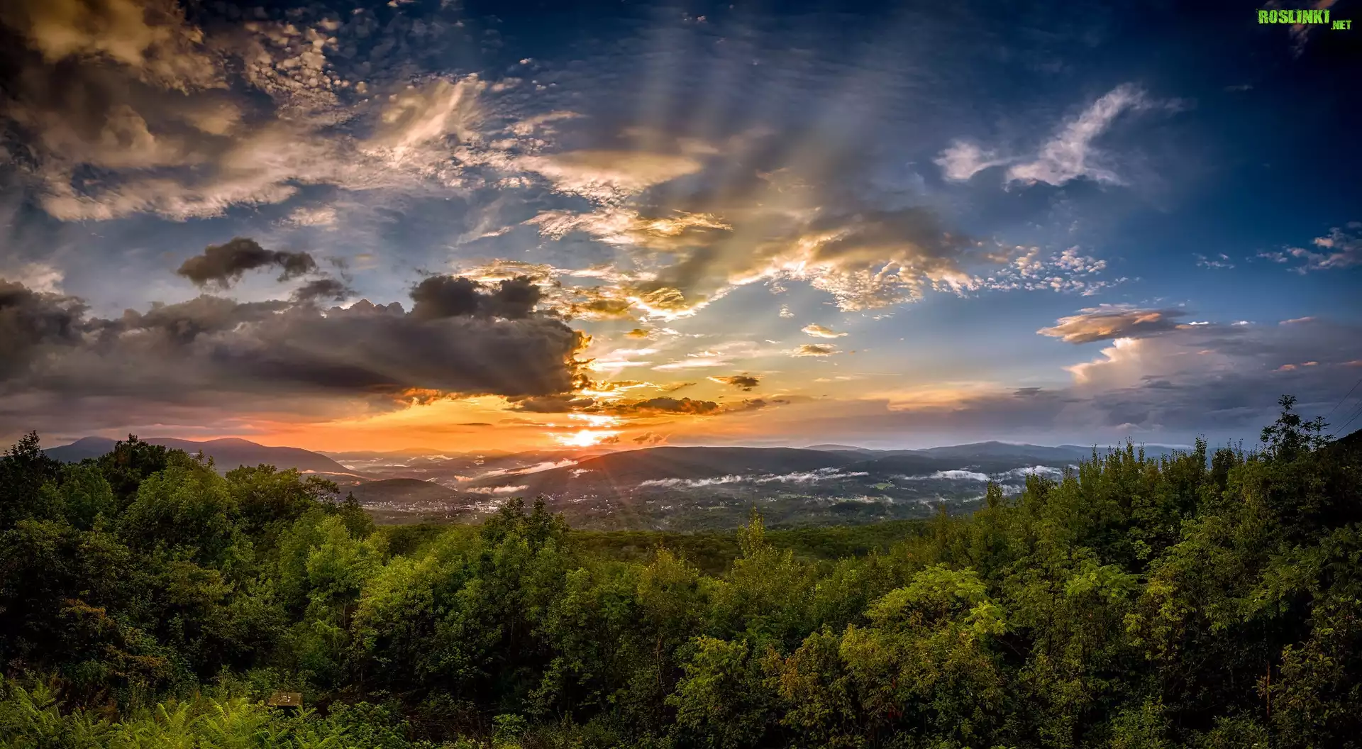 Rośliny: Góry, Drzewa, Wschód słońca, Chmury