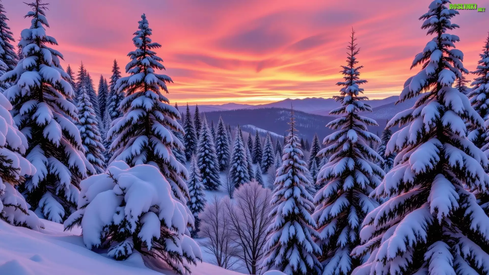 Rośliny: Zima, Zachód słońca, Kolorowe, Niebo, Ośnieżone, Drzewa, Góry