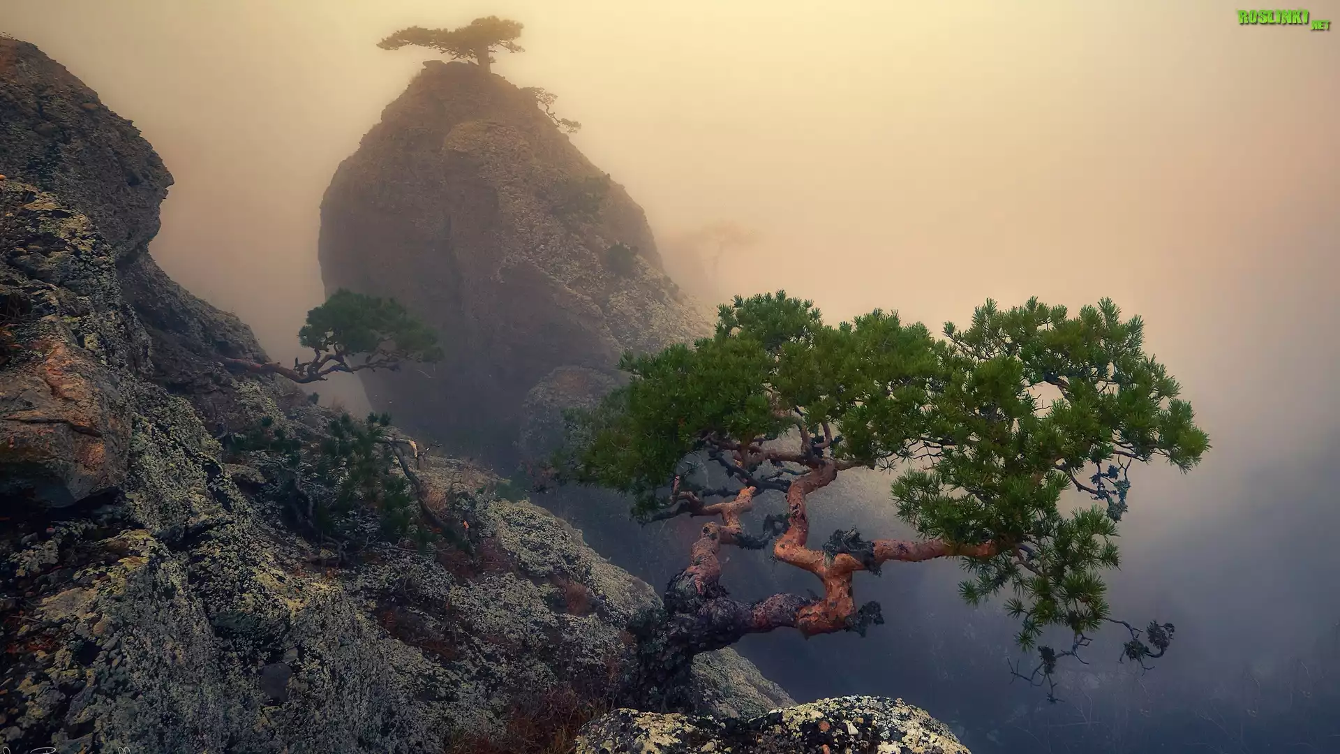 Rośliny: Góry, Skały, Sosna, Mgła
