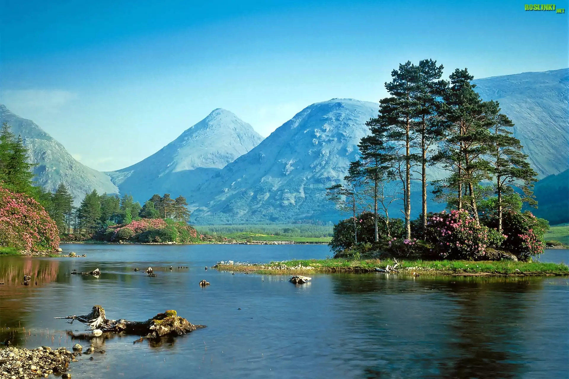 Rośliny: Góry, Lasy, Jezioro, Wysepka, Sosny, Rododendrony
