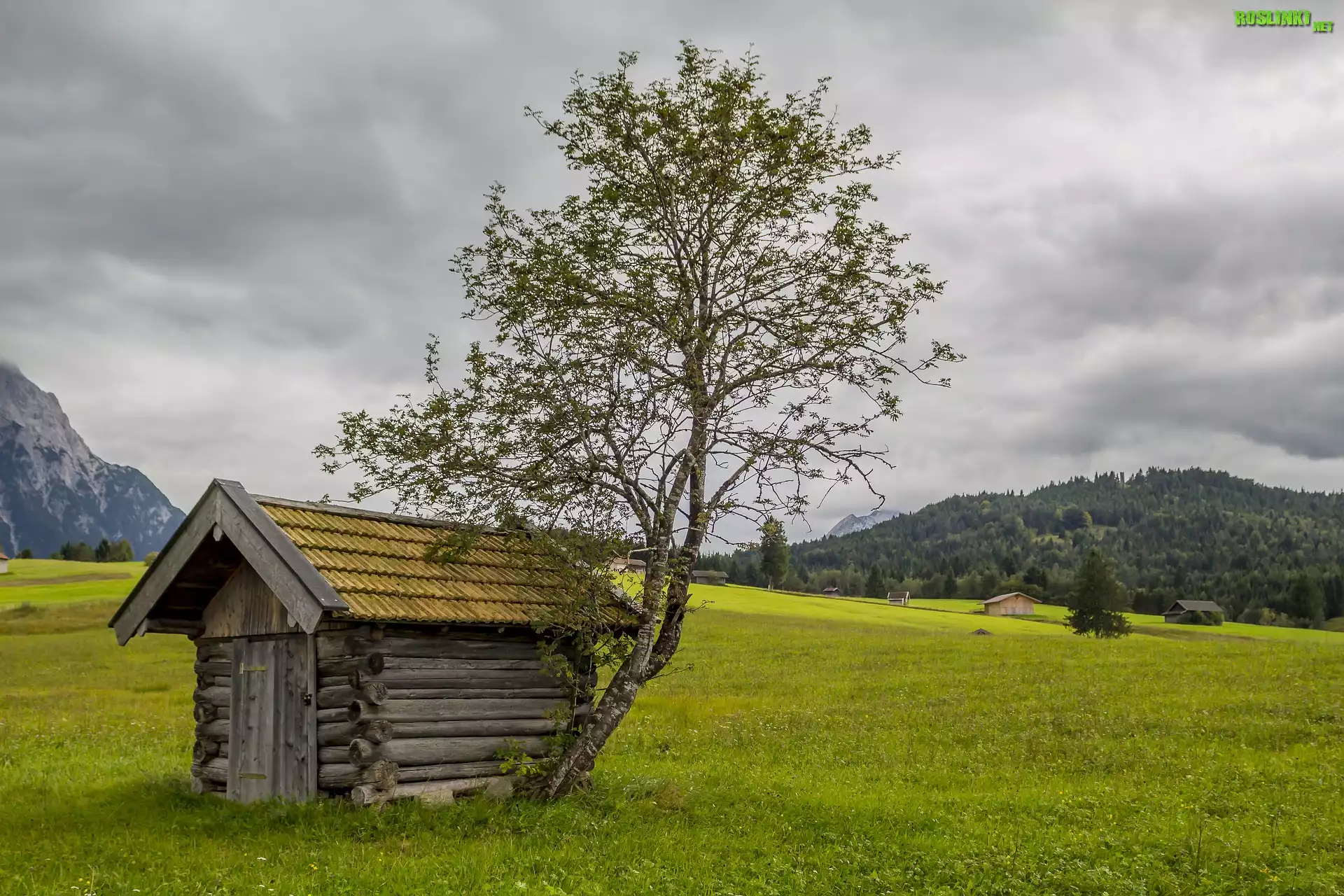 Rośliny: Łąka, Szopa, Drzewo, Góry, Chmury
