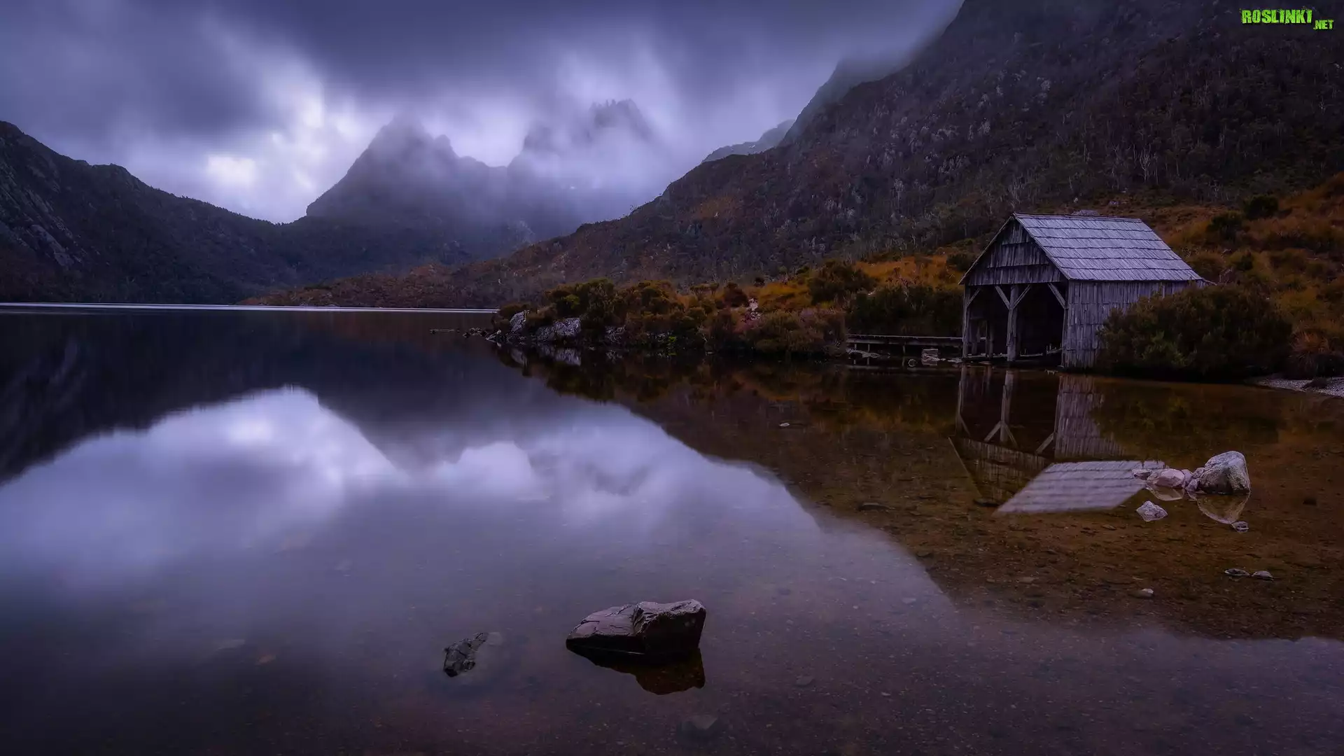Góry, Cradle Mountain, Park Narodowy Cradle Mountain, Jezioro, Dove Lake, Drzewa, Szopa, Mgła, Tasmania, Australia |