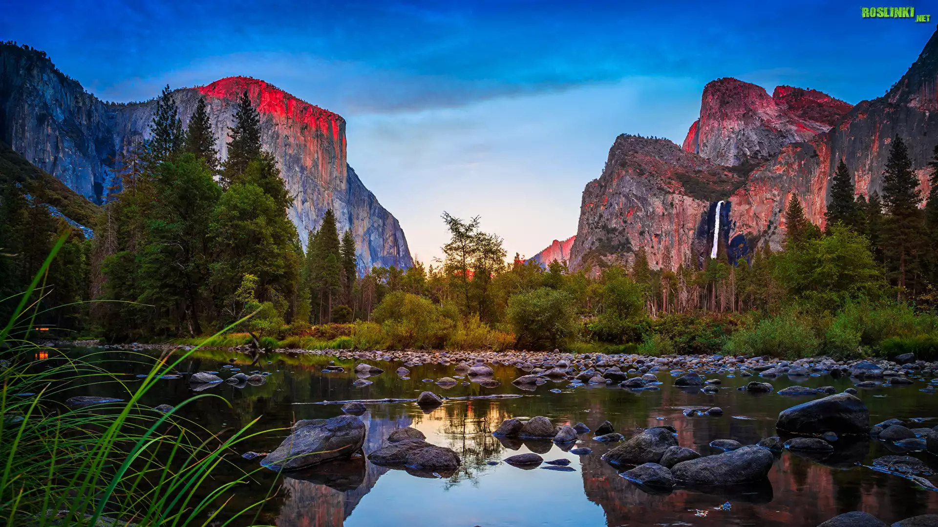 Góry, Niebo, Drzewa, Trawa, Rzeka Merced, Kamienie, Park Narodowy Yosemite, Kalifornia, Stany Zjednoczone |