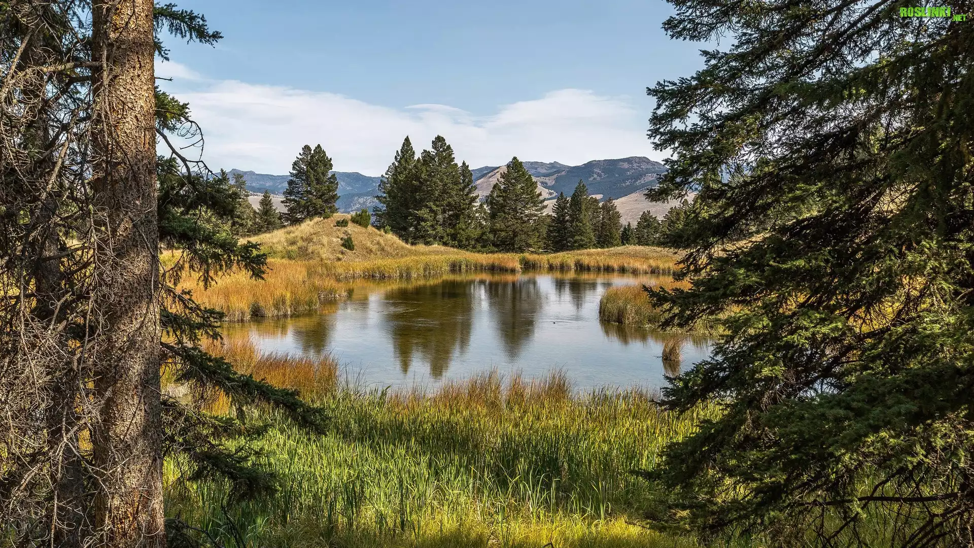 Rośliny: Góry, Staw, Trawa, Drzewa