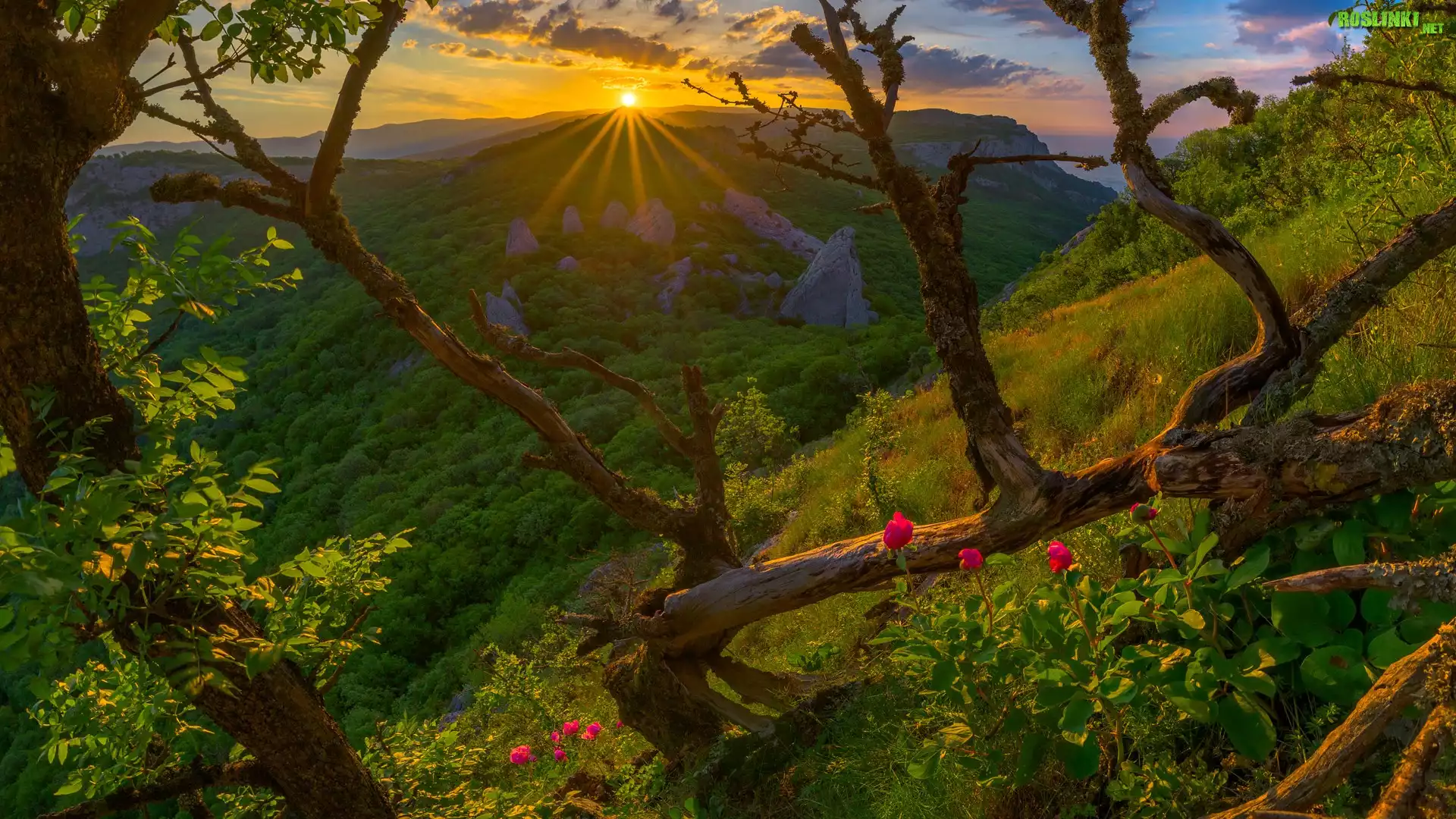 Ukraina, Góry Krymskie, Promienie słońca, Drzewa, Kwiatki