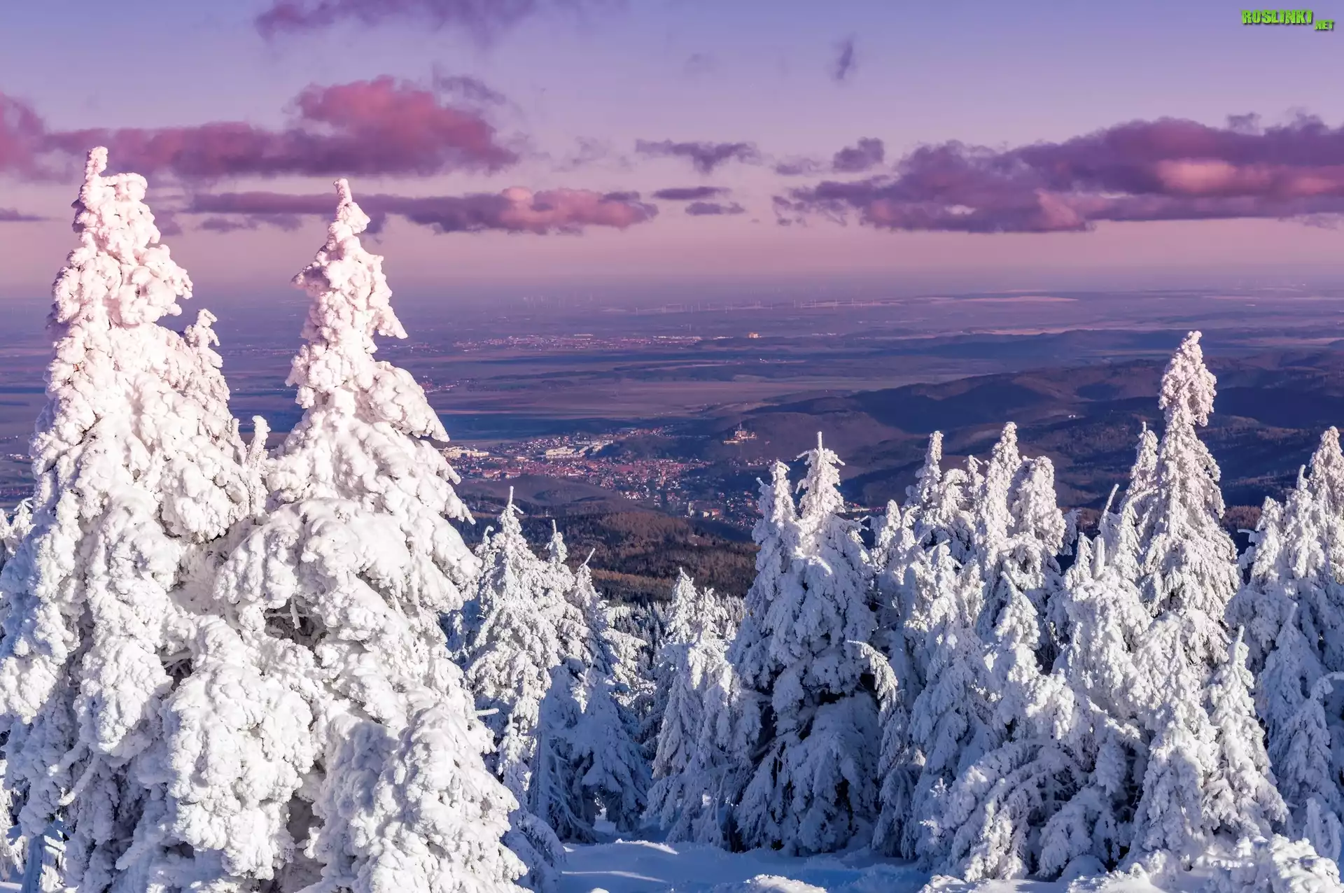 Niemcy, Saksonia-Anhalt, Miasto Wernigerode, Zima, Śnieg, Drzewa, Świerki, Góry