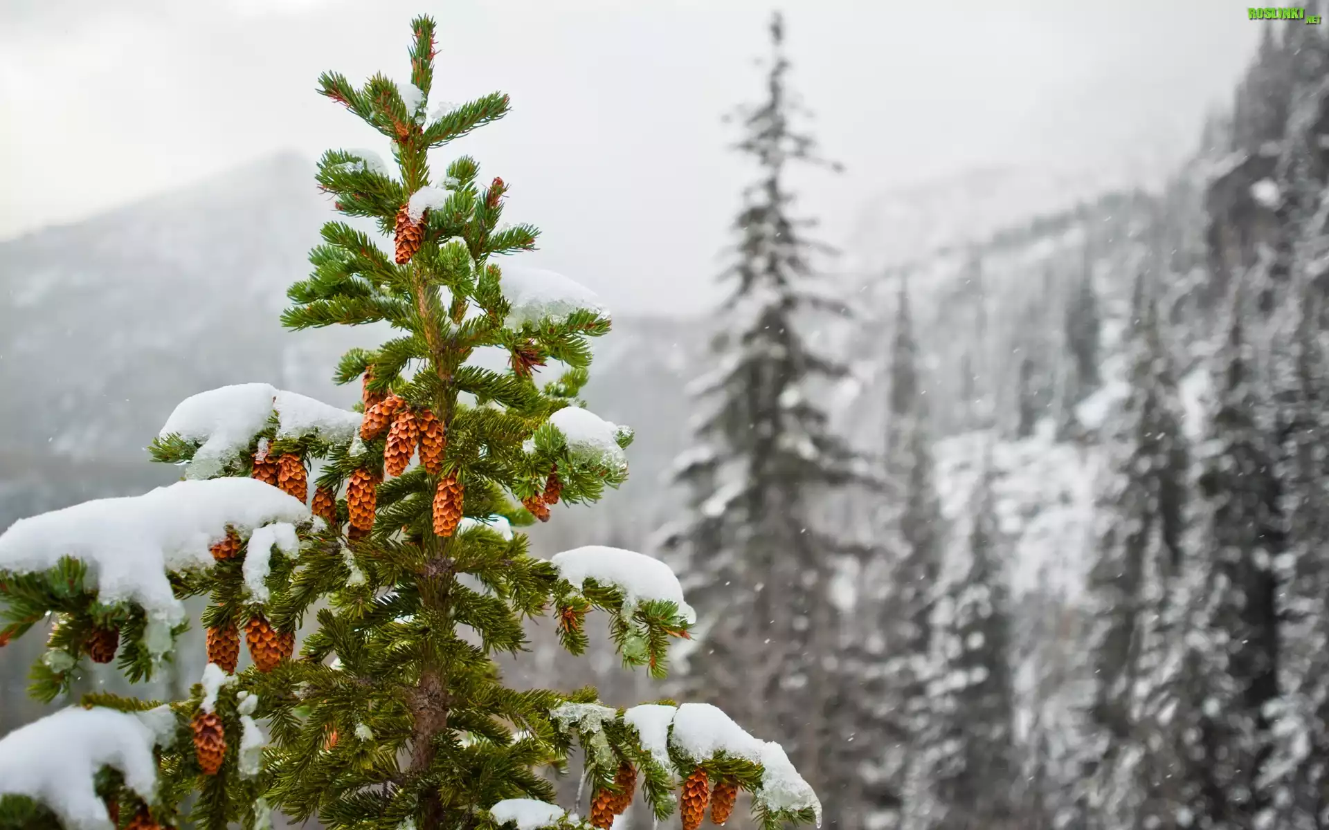 Rośliny: Góry, Śnieg, Świerki, Szyszki