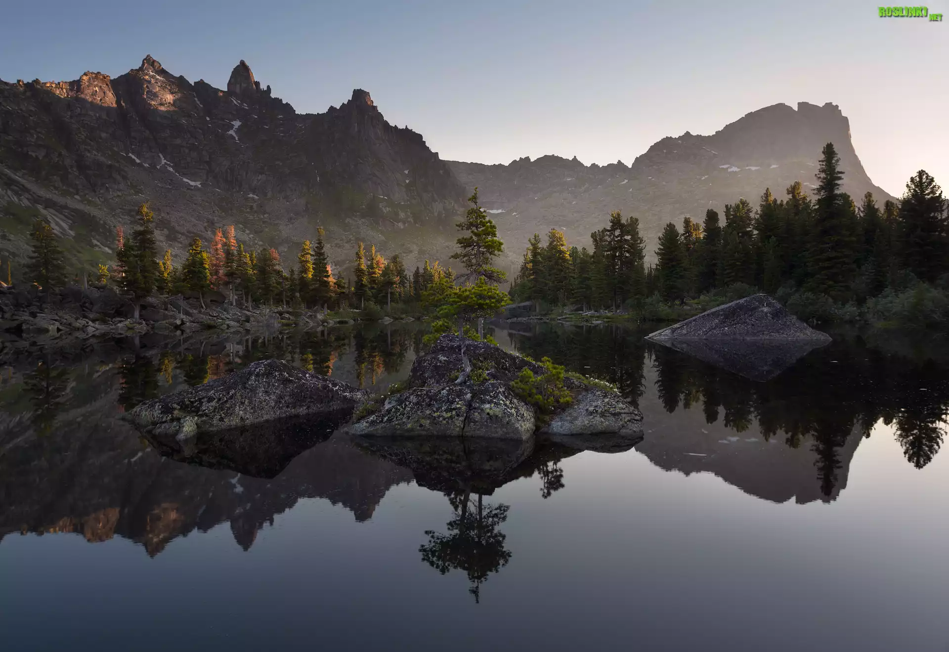 Rośliny: Góry, Jezioro, Skały, Drzewa, Świerki, Odbicie