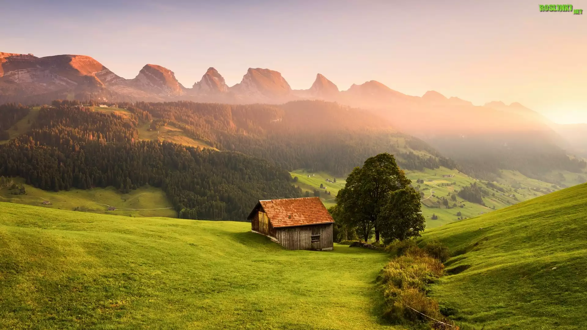 Rośliny: Góry, Las, Drzewa, Domy, Wschód słońca