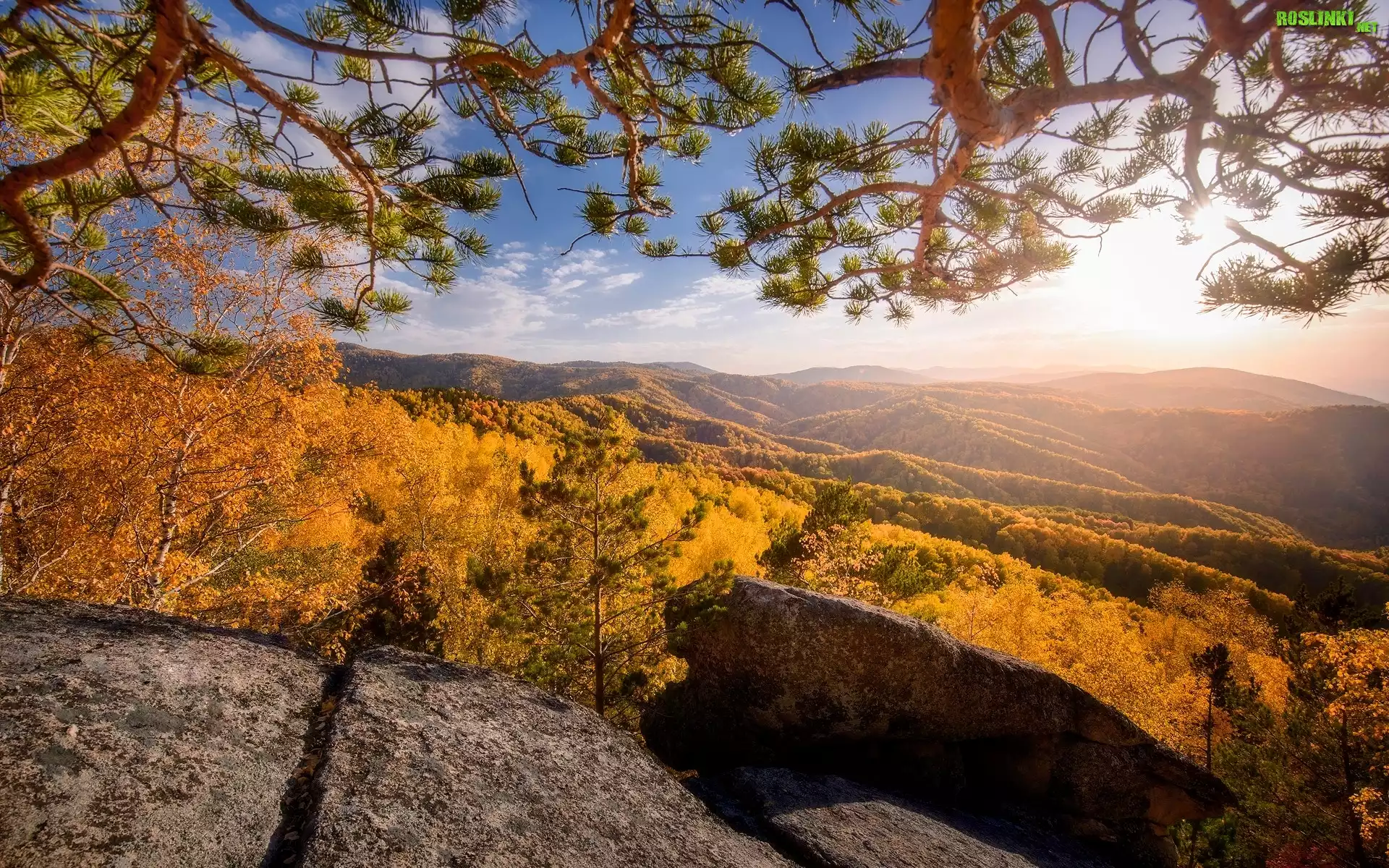 Rośliny: Wzgórza, Góry, Drzewa, Jesień, Drzewo, Sosna, Kamień