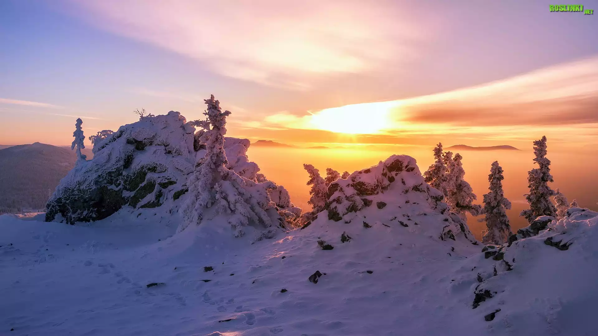 Rośliny: Wzgórza, Góry, Drzewa, Mgła, Wschód słońca, Zima