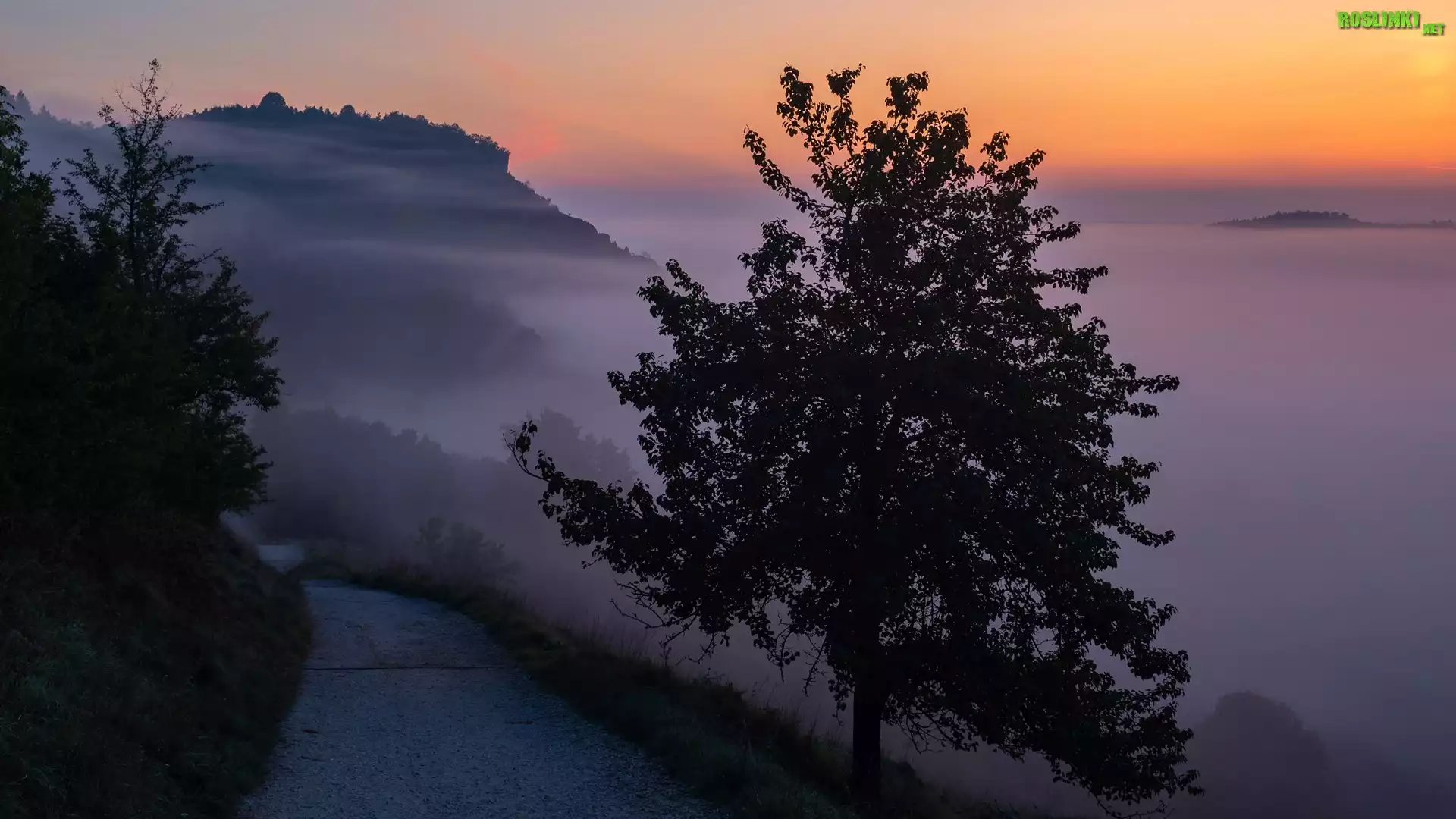 Rośliny: Góry, Drzewa, Droga, Mgła, Zachód słońca