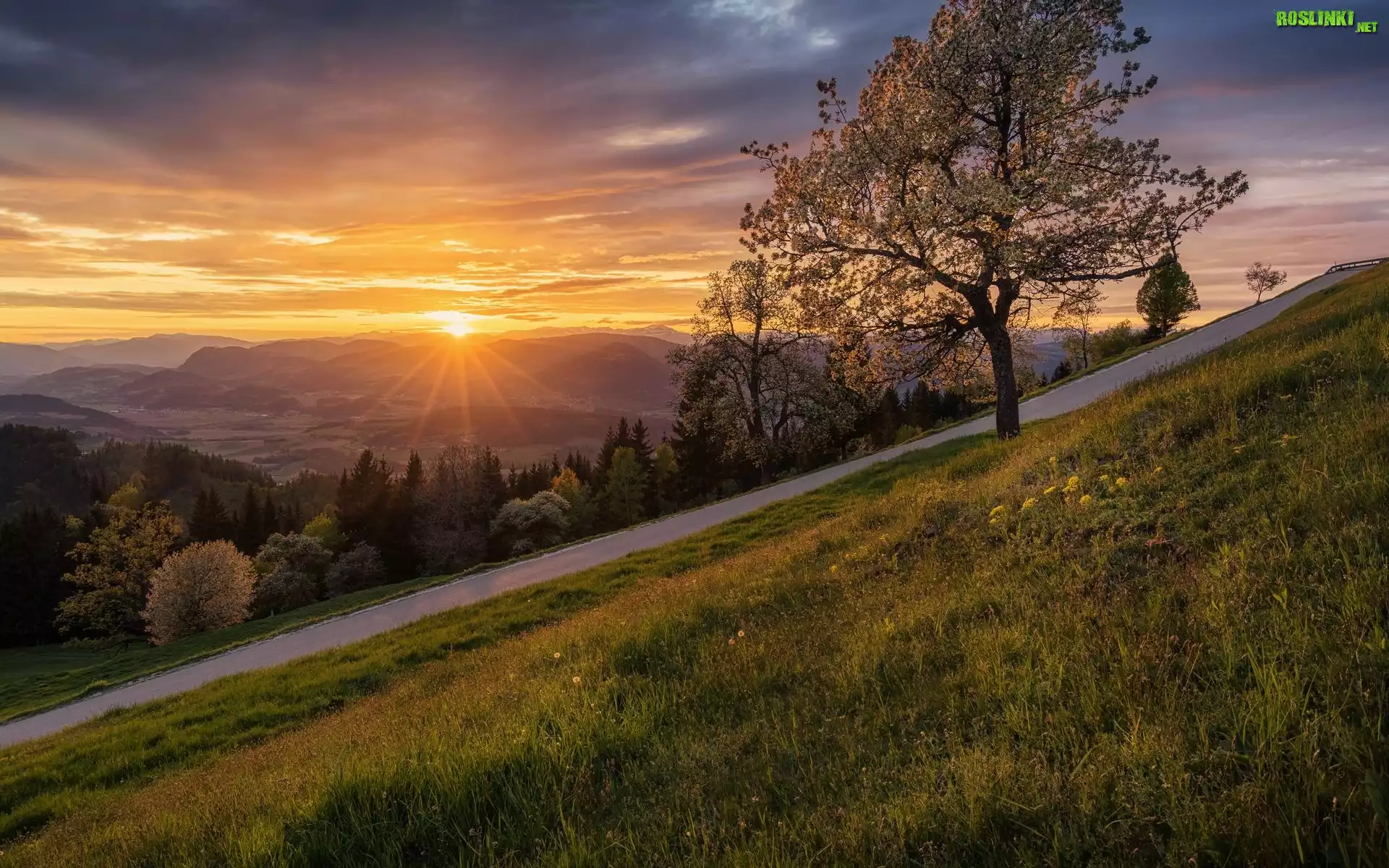 Rośliny: Góry, Las, Drzewa, Droga, Zachód słońca