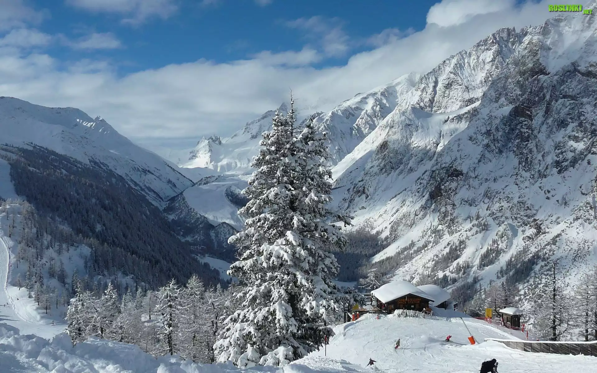 Rośliny: Góry, Lasy, Budynki, Narciarze, Zima, Drzewo