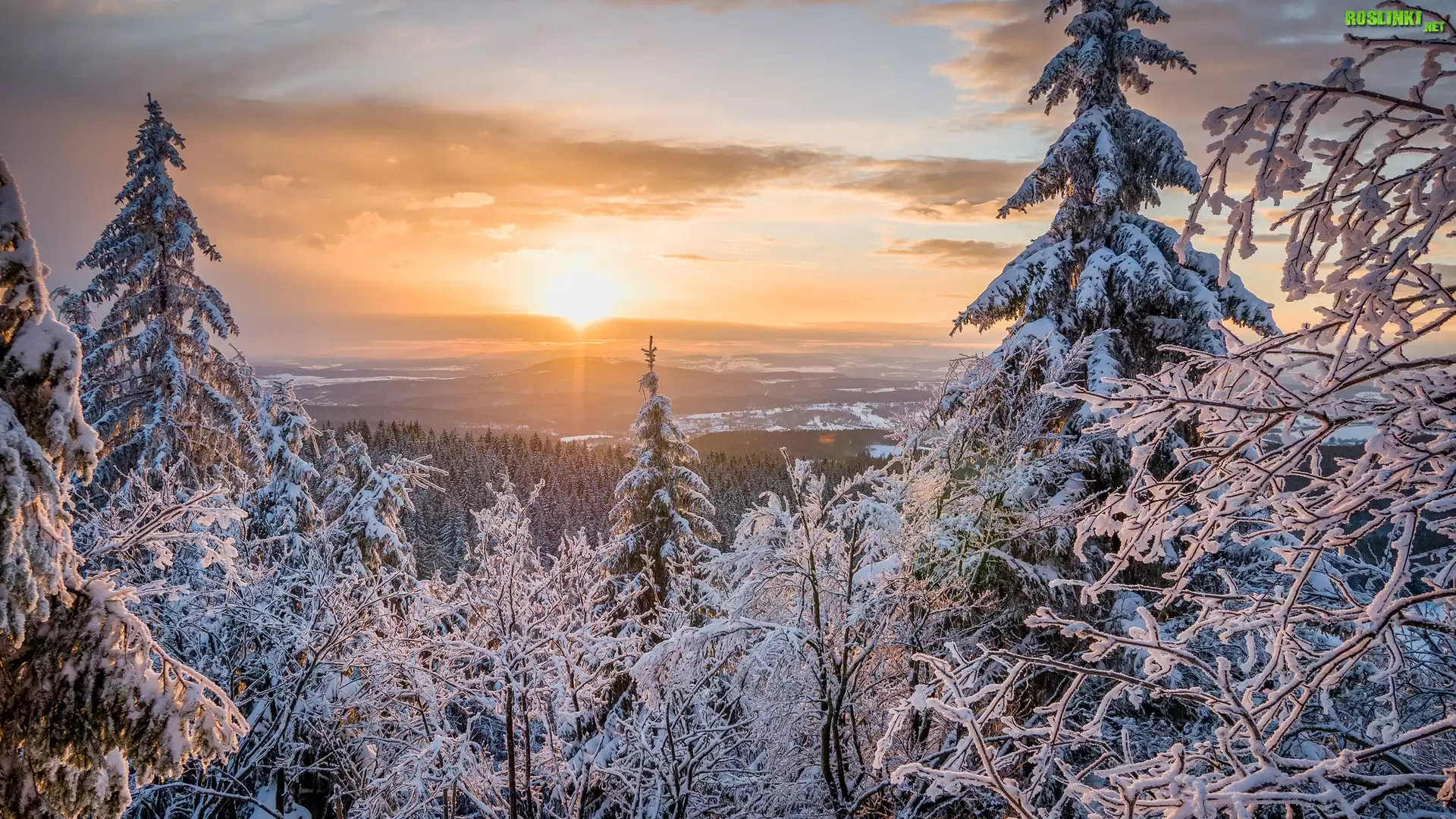 Rośliny: Zima, Góry, Drzewa, Las, Wschód słońca, Chmury