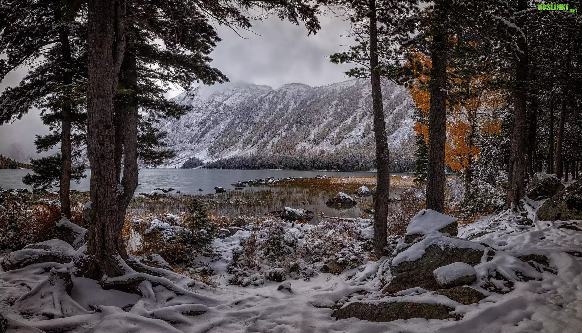 Rośliny: Zima, Góry, Las, Drzewa, Jezioro, Śnieg, Kamienie