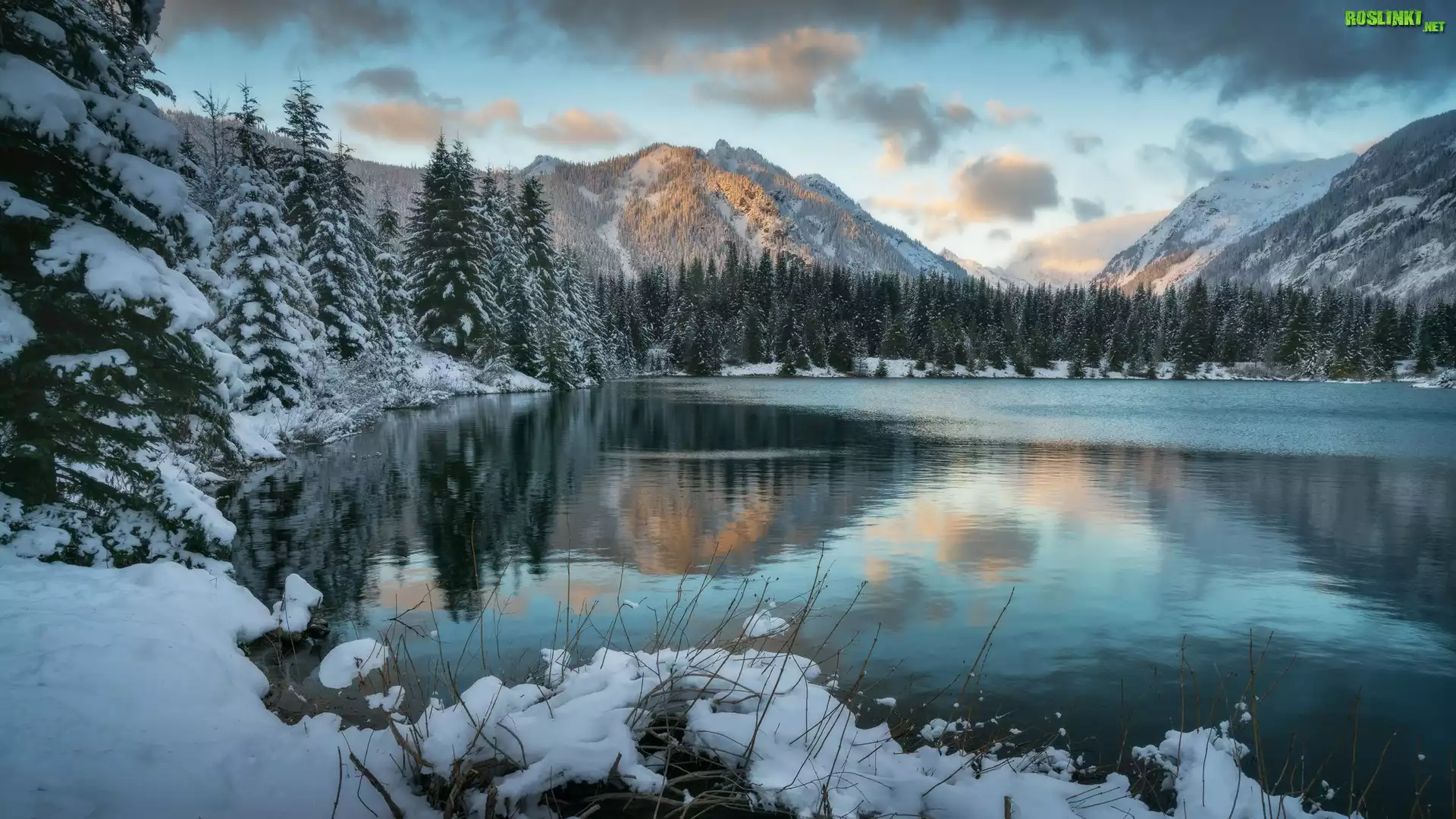 Zima, Drzewa, Lasy, Śnieg, Góry Kaskadowe, Jezioro Gold Creek Pond, Stan Waszyngton, Stany Zjednoczone |