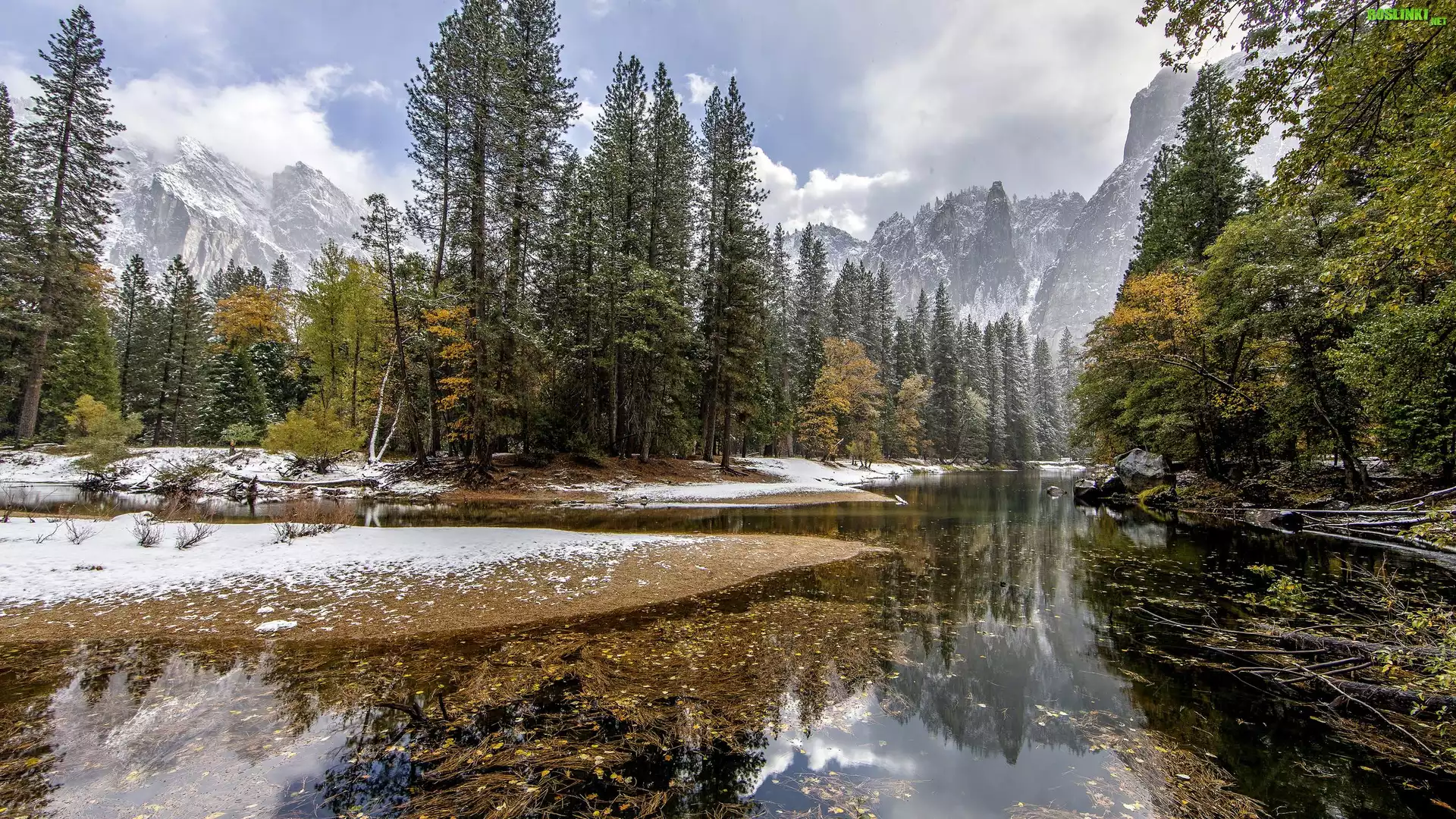 Rośliny: Zima, Rzeka, Tuolumne River, Drzewa, Góry, Park Narodowy Yosemite, Kalifornia, Stany Zjednoczone