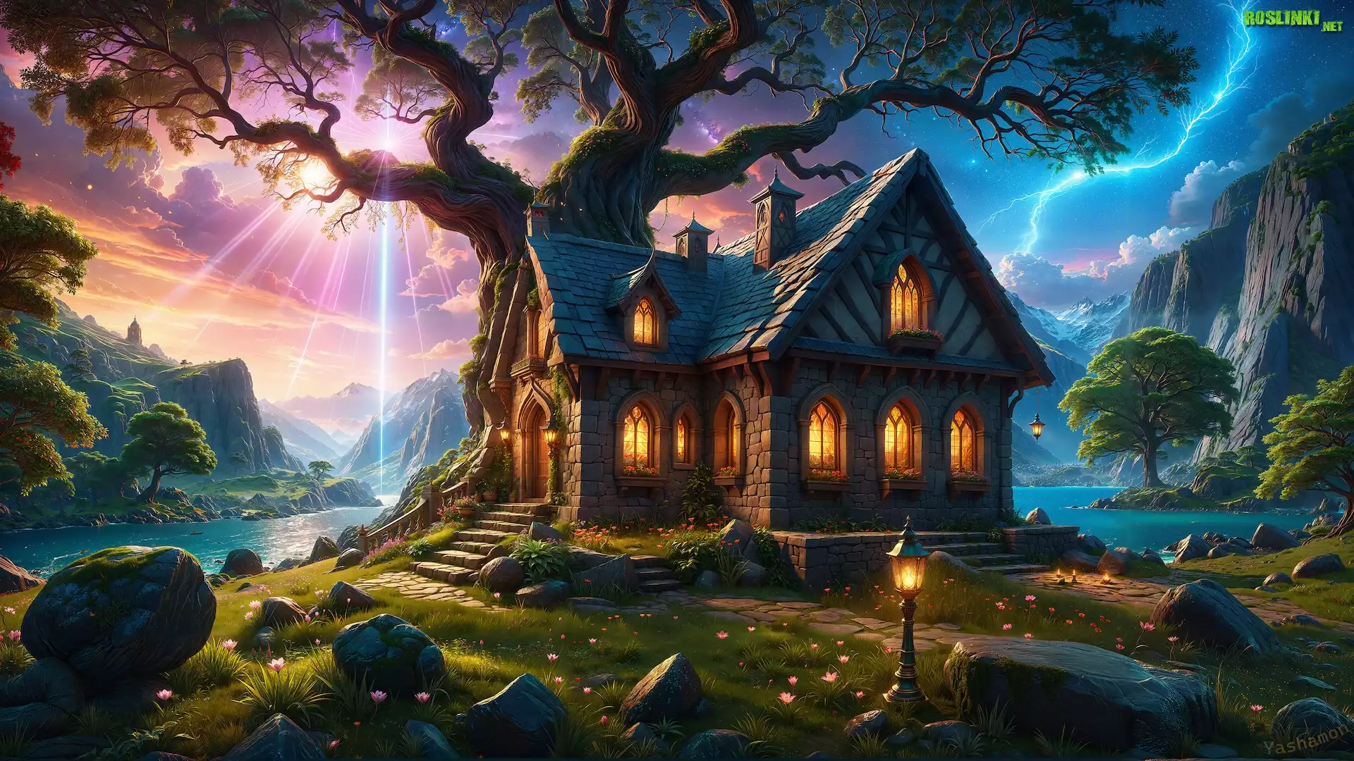 Rośliny: Grafika, Dom, Oświetlony, Drzewo, Promienie słońca, Błyskawice, Góry, Rzeka