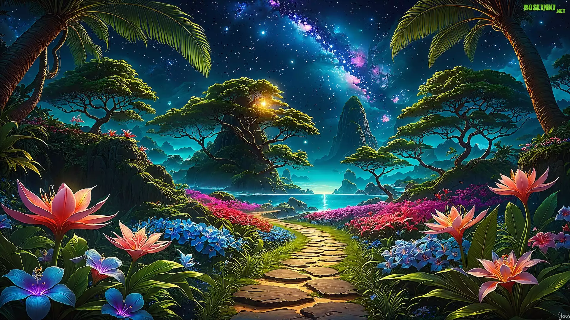Rośliny: Grafika, Ścieżka, Kamienna, Niebo, Droga Mleczna, Drzewa, Palmy, Kwiaty