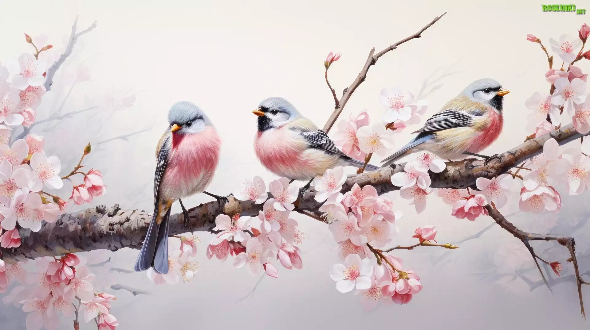 Trzy, Ptaki, Gałąź, Różowe, Kwiaty, Drzewo owocowe, Grafika