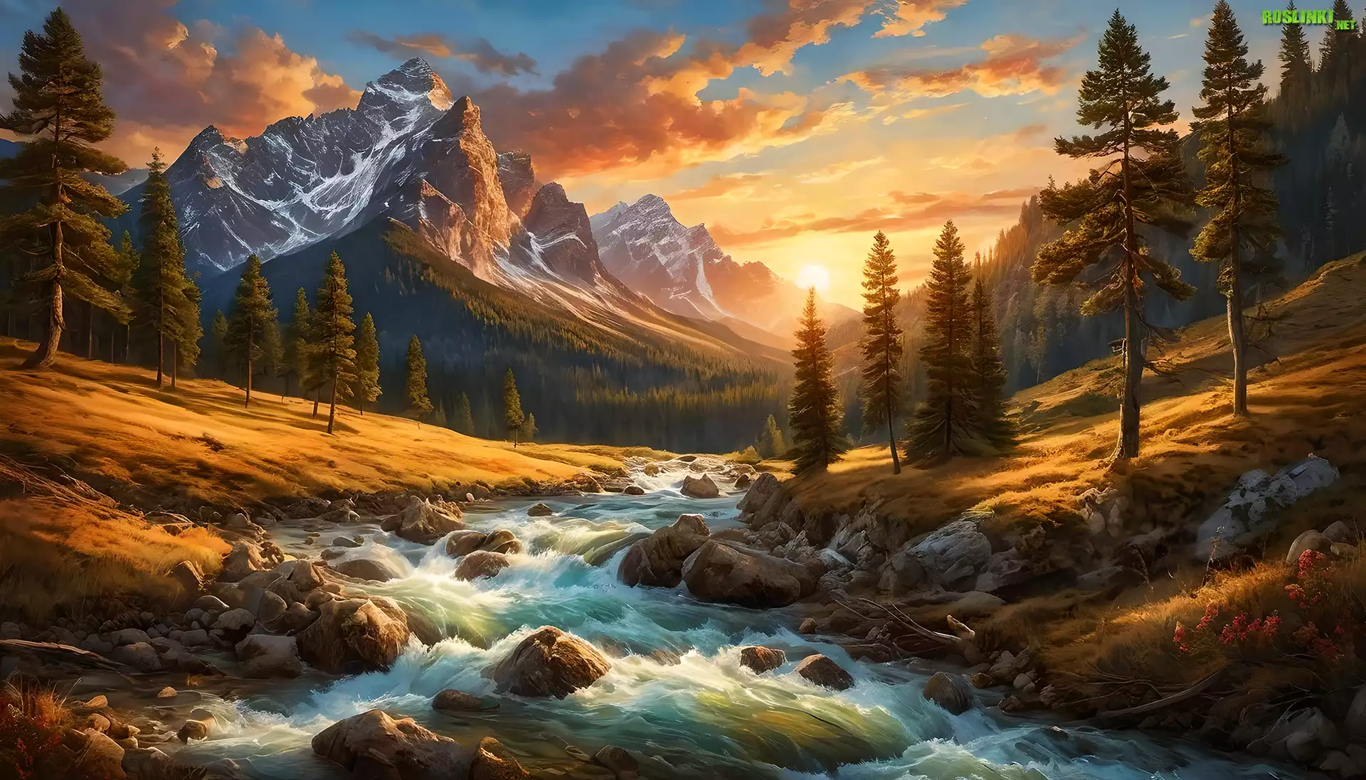 Rośliny: Rwąca, Rzeka, Góry, Drzewa, Sosny, Zachód słońca, Grafika